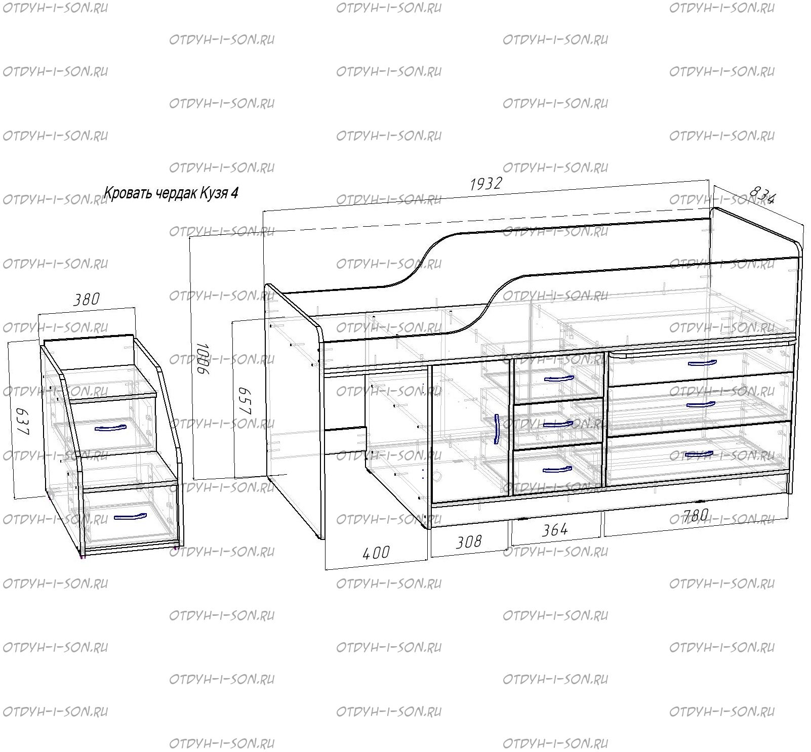 Кровать-чердак Кузя-4 Характеристики: Размер спального места: 70х190 или 80х190 см. Габариты: 1006*1932*900 мм. Уточняйте у оператора Габариты лестницы: 620*380*836 мм Состав комплекта: кровать+лестница Складская программа Вес: Объем: Цвет корпуса: яблоня, венге, орех, ольха, дуб молочный, бук. Цвет фасада: бук, яблоня, дуб молочный, венге, орех, ольха, ясень шимо светлый, ясень шимо темный, оранжевый, зозовый, синий, зеленый, ваниль. Любой цвет корпуса Вы можете скомбинировать с любым цветом фасада. К нижней кровати вы можете приобрести дополнительный съемный бортик, который убережет ребенка от падения.