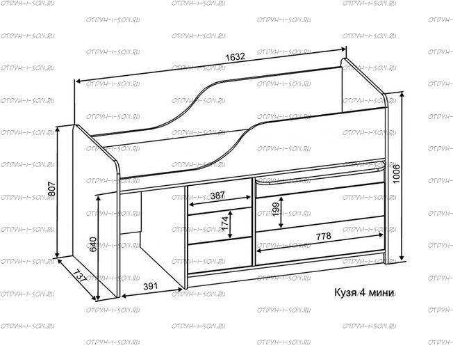 Кровать-чердак Кузя-4 Мини - это недорогая, компактная и удобная деткая кровать-чердак с игровым местом и встроенными полками.
