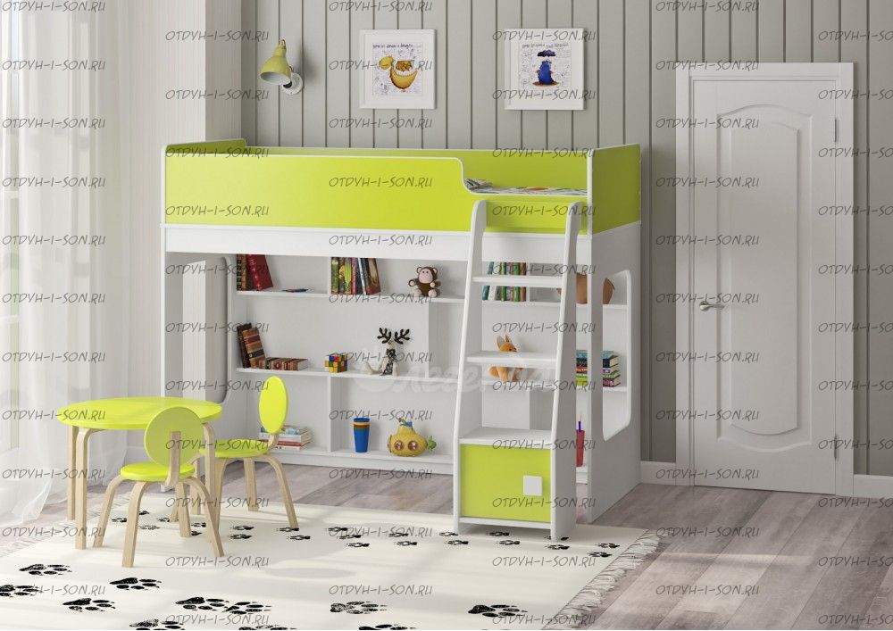 Кровать-чердак Легенда 42.2.1 - это удобный, компактный и функциональный комплект детской мебели. Комплекс состоит из кровати-чердака, шкафа для одежды, стола и полки.