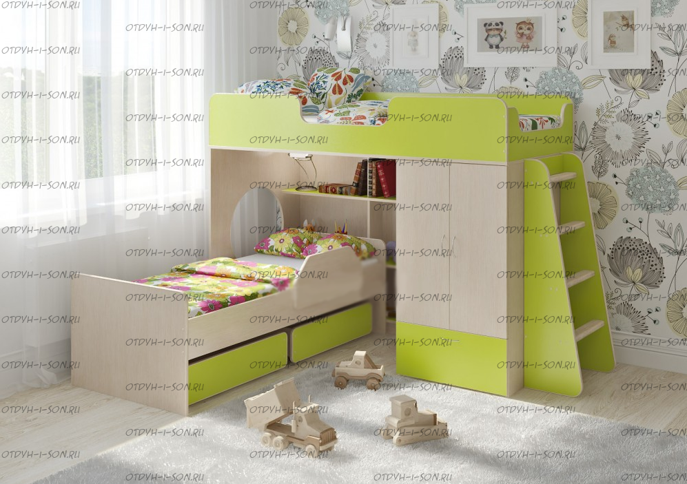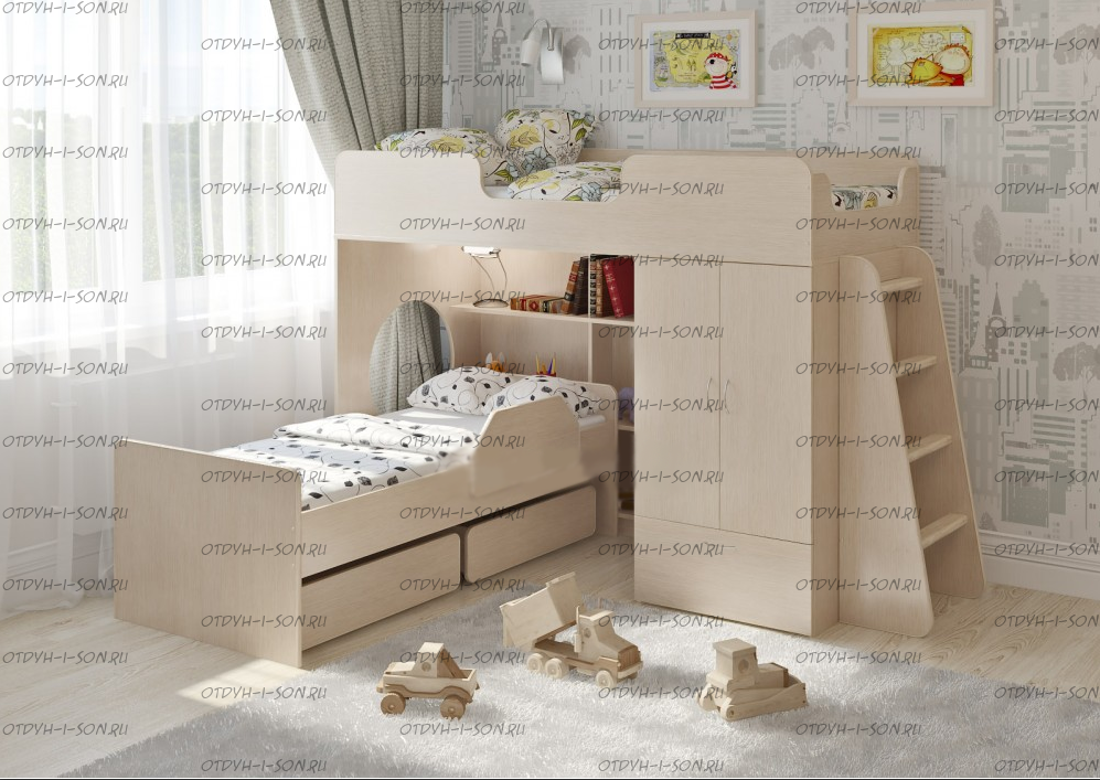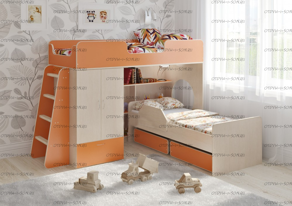 Кровать-чердак Легенда-3.9 Характеристики: Размер: 80Х180 см.+ 70х160 Внешние габариты (ДхШхВ): 1848 Х 834 Х 1395 мм. Корпус : ЛДСП, 16 мм. Высота борта: 30см Ширина лестницы: 45см Нестандарт: нет Вес: 147 кг. Объем: 0,39 м3 кол-о коробок 9 шт Цвет корпуса: ольха, венге светлый Цвет фасада: венге светлый, ольха, венге темный, голубой, оранжевый, розовый, лайм Предоплата: нет Двухъярусная кровать Л-3.9 – классный комплект мебели для двоих детей. Комплект занимает немного места - решение для площади малых габаритов, экономия пространства.