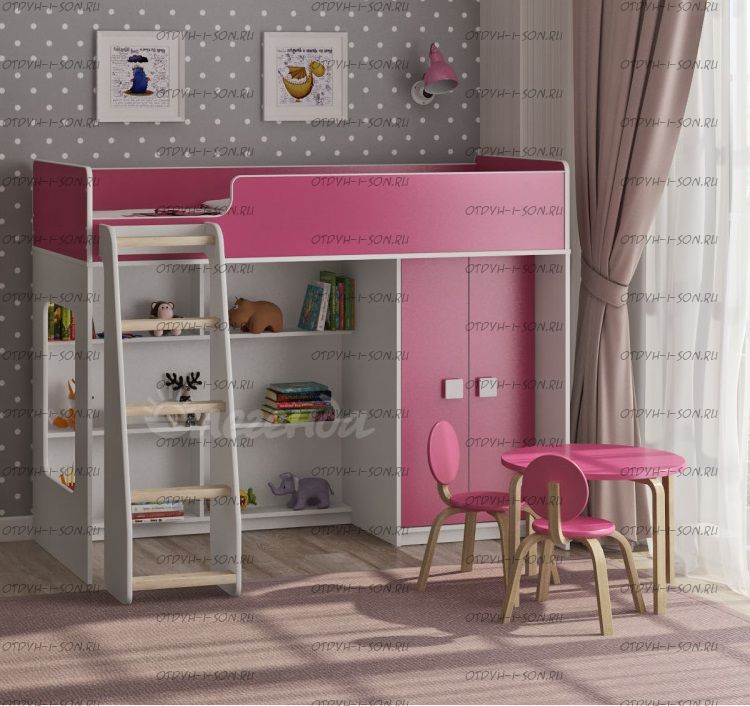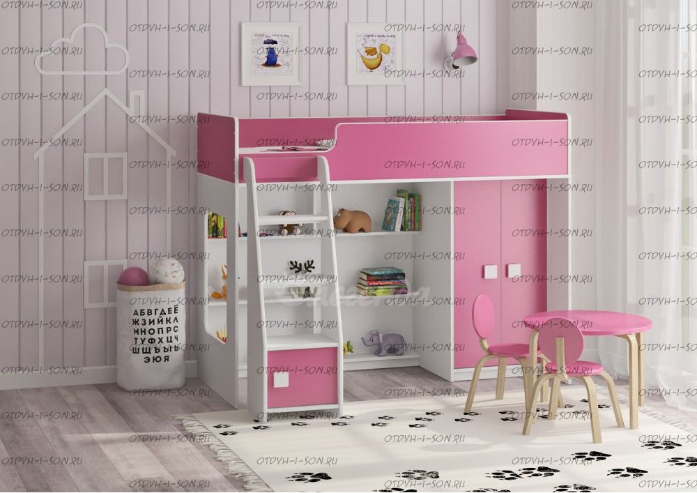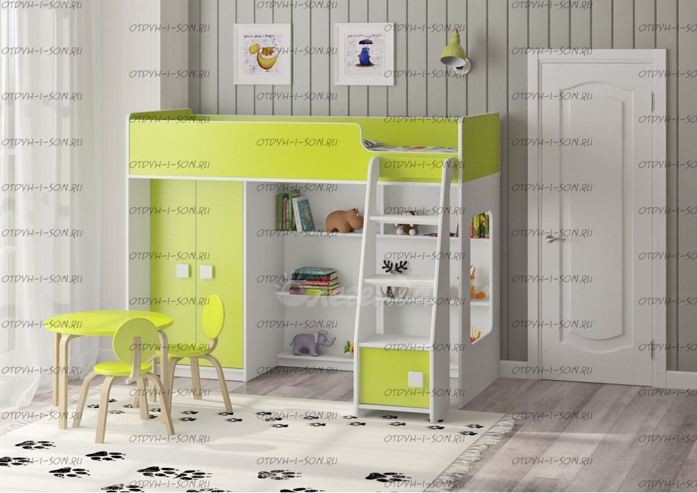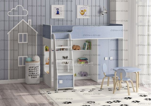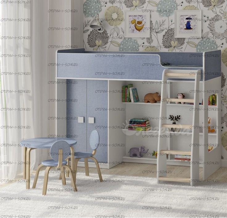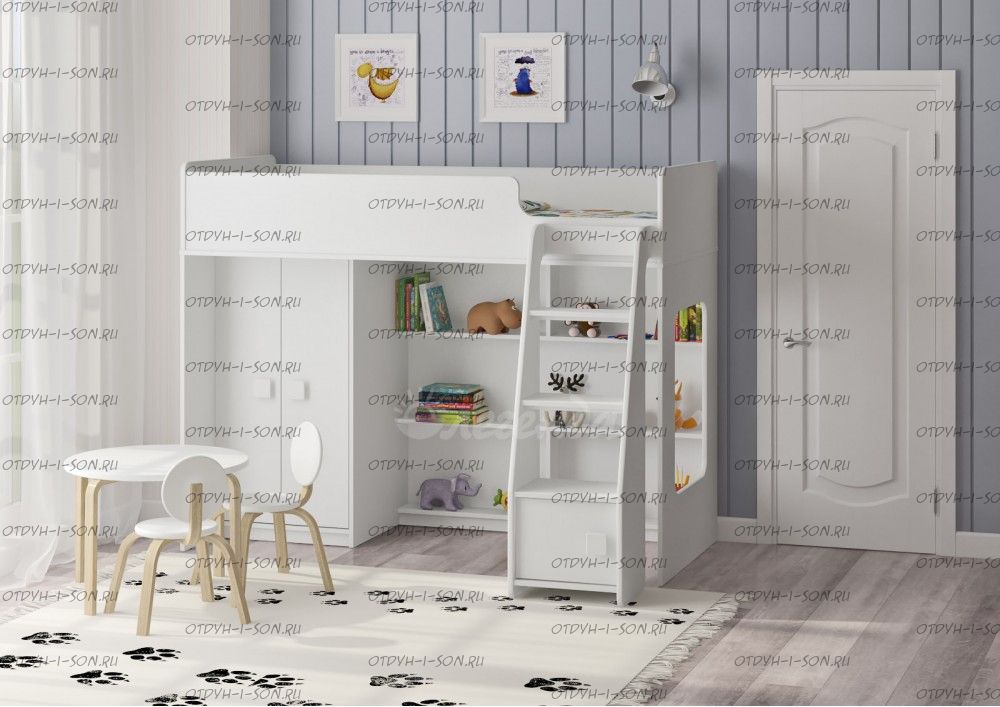 Кровать-чердак Легенда 42.1.1 - это удобный, компактный и функциональный комплект детской мебели. Комплекс состоит из кровати-чердака, шкафа для одежды, стола и полки.