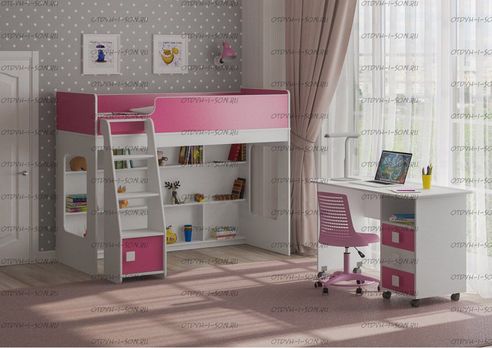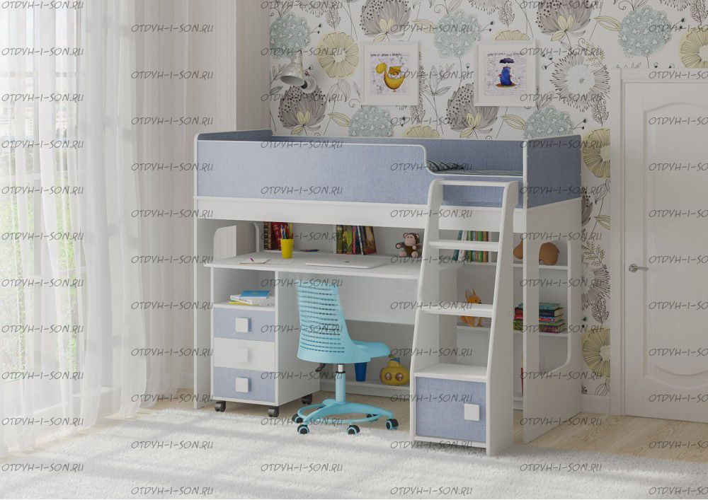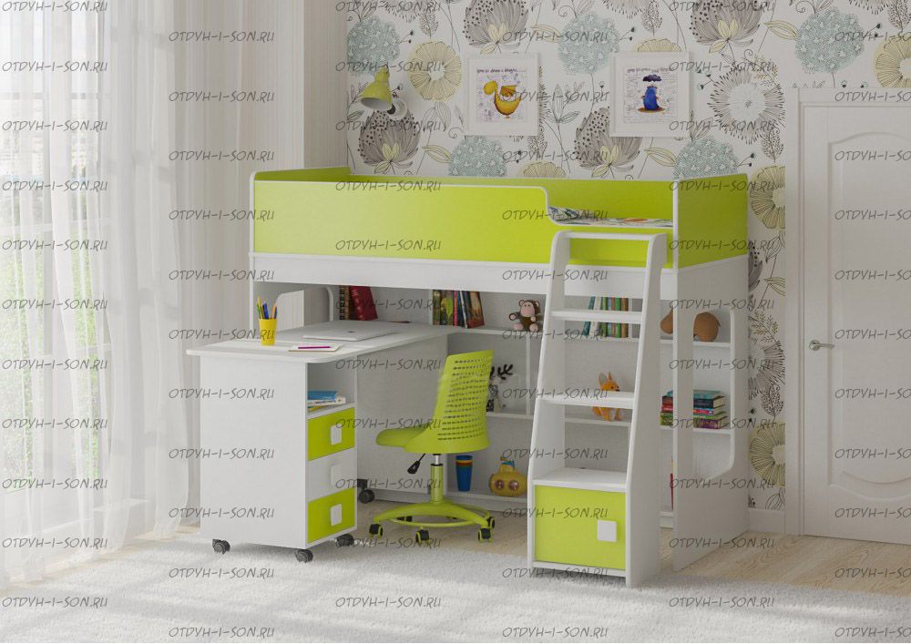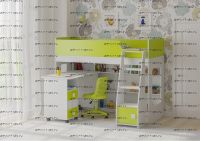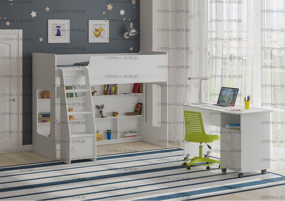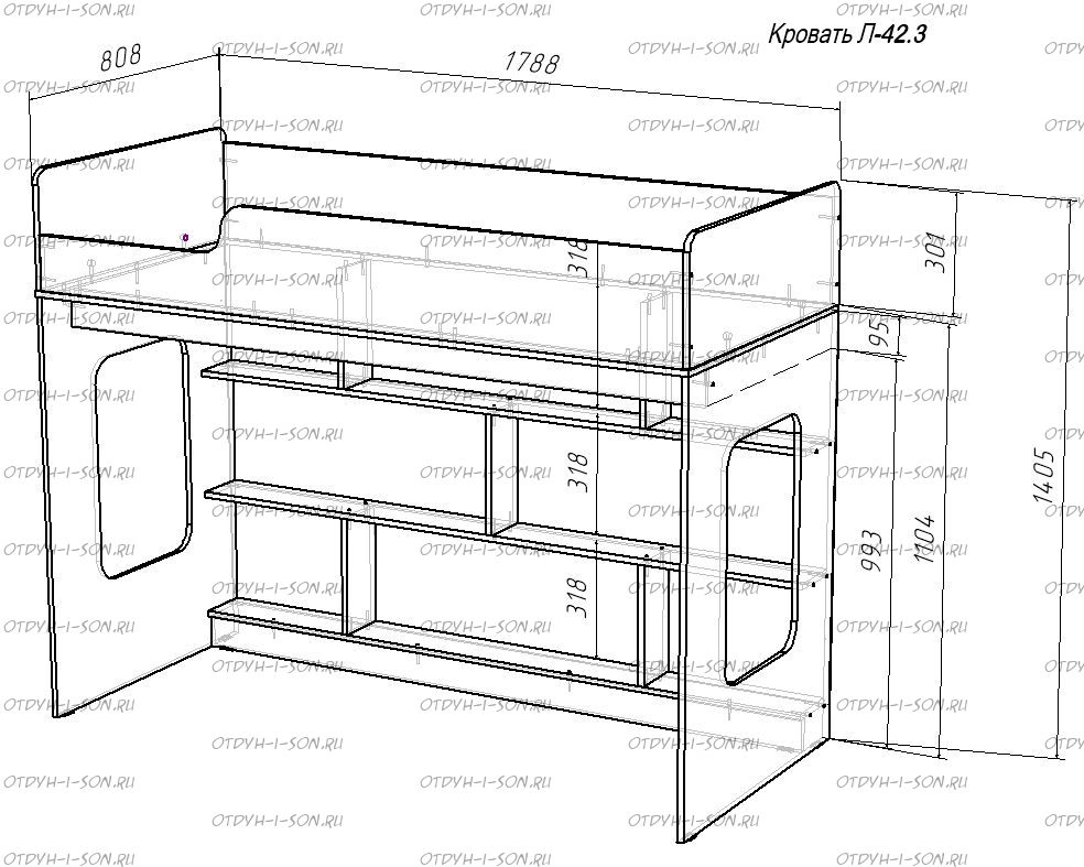 Кровать-чердак Легенда 42.3.7 - это удобный, компактный и функциональный комплект детской мебели. Комплекс состоит из кровати-чердака, шкафа для одежды, стола и полки.