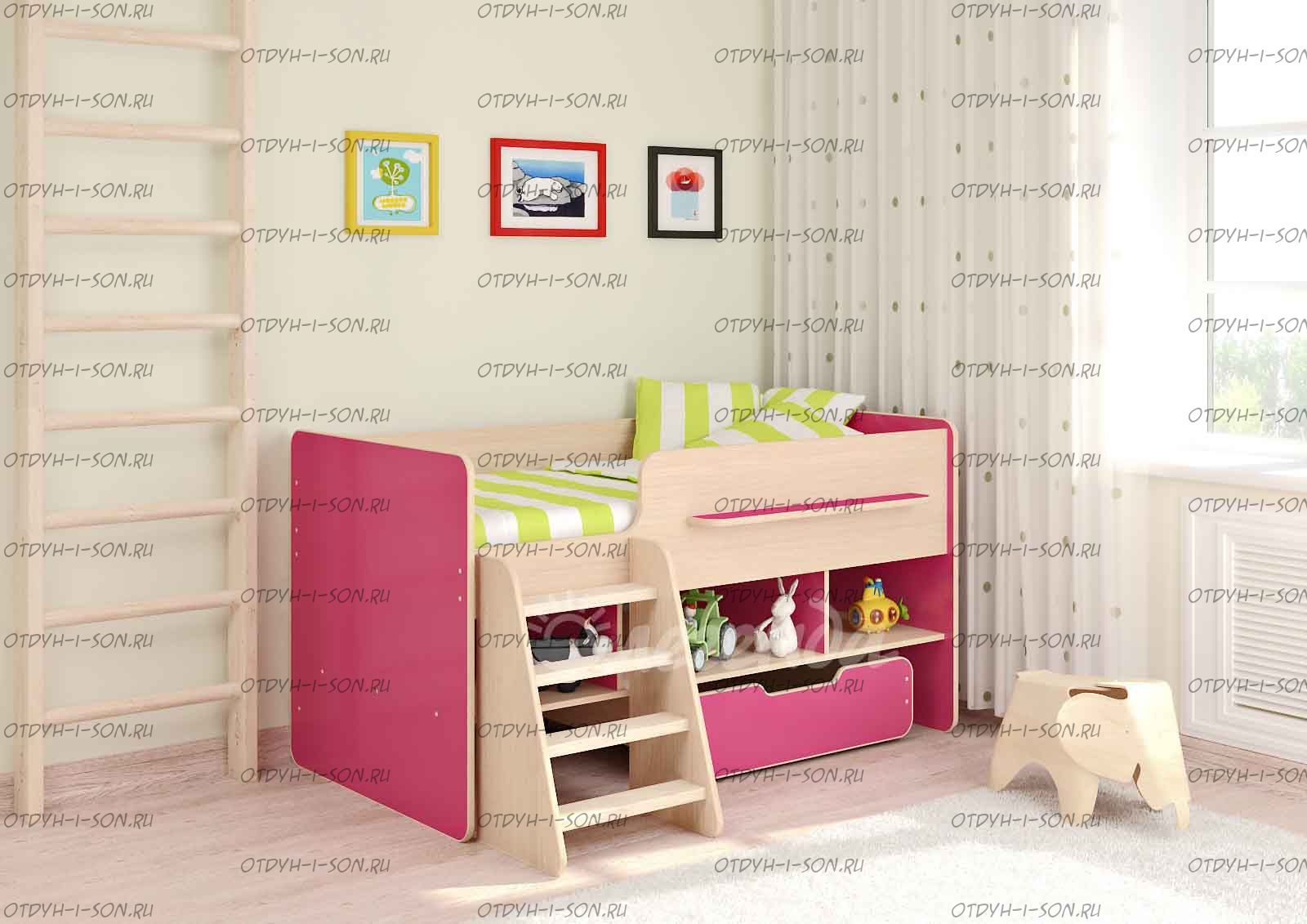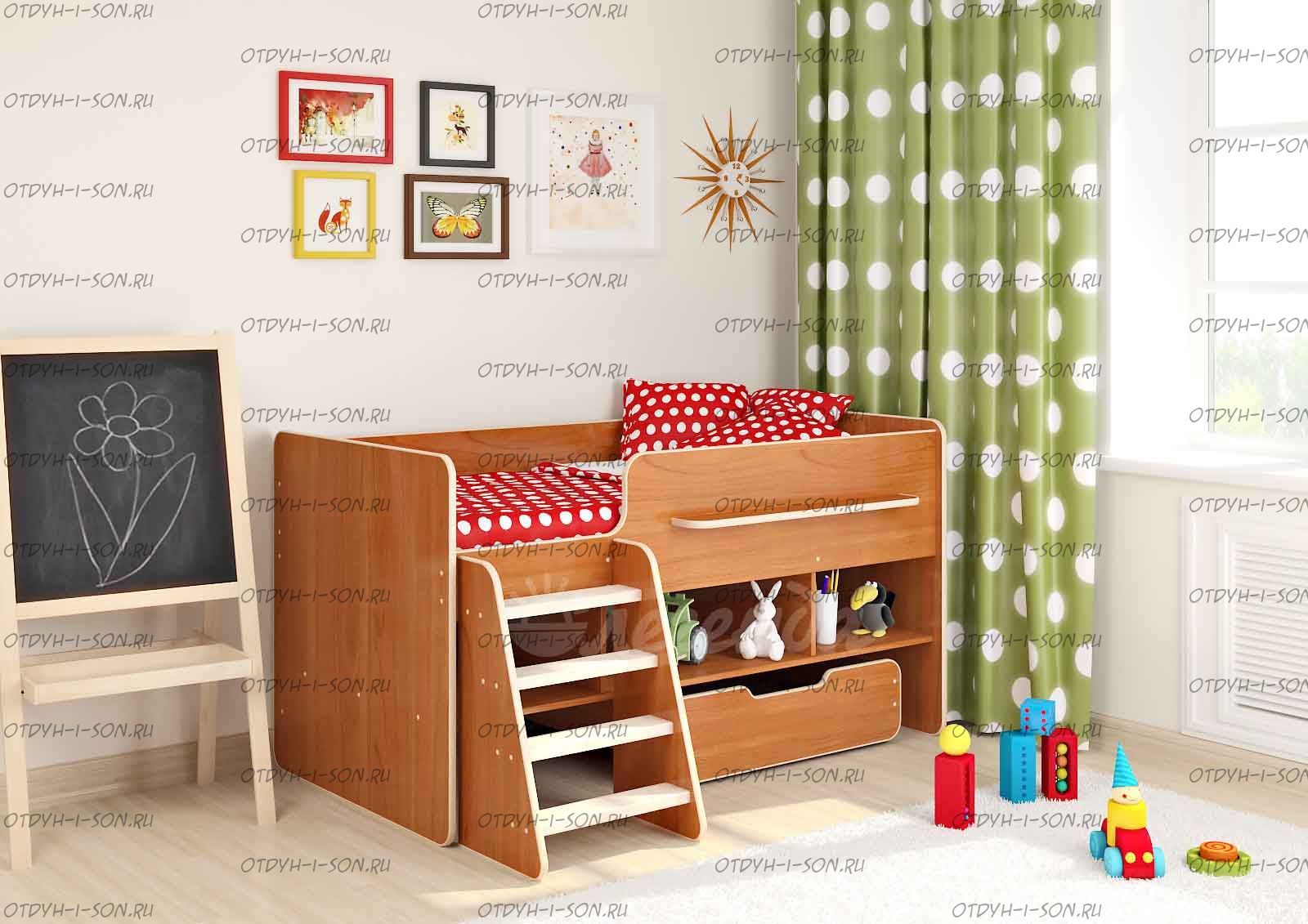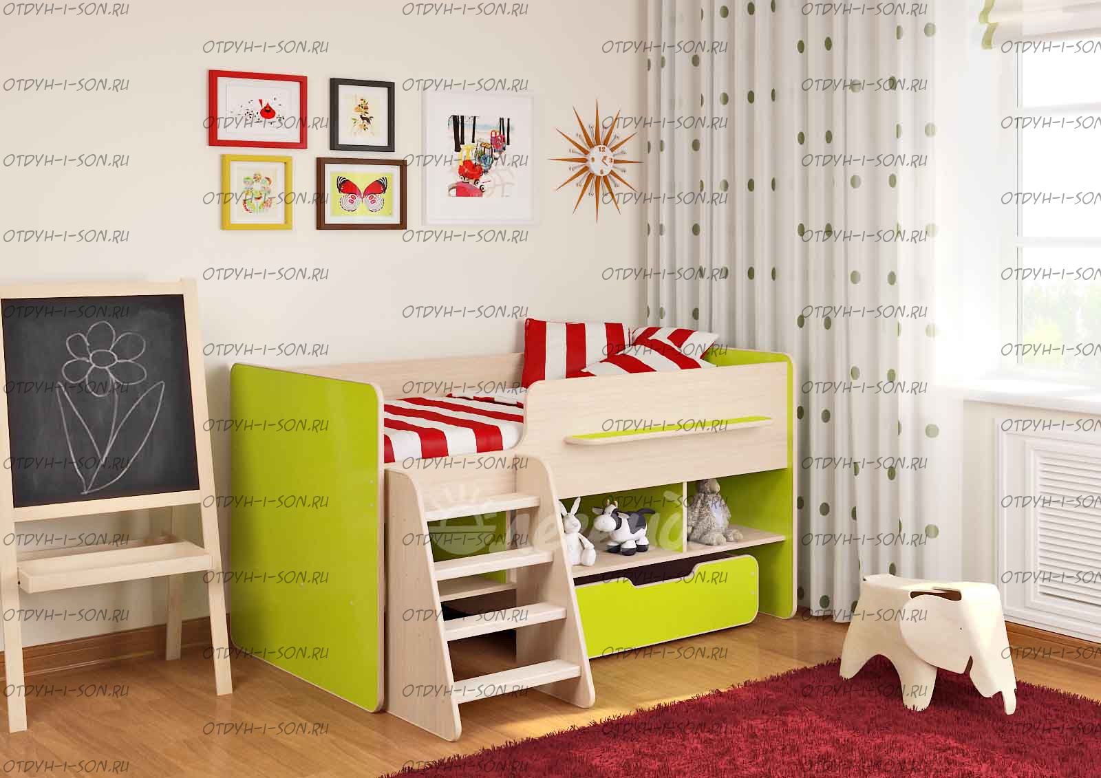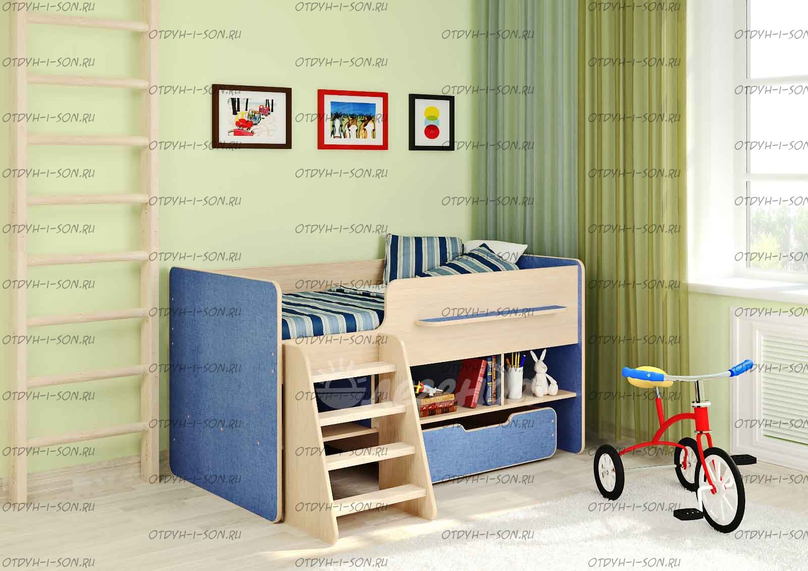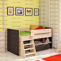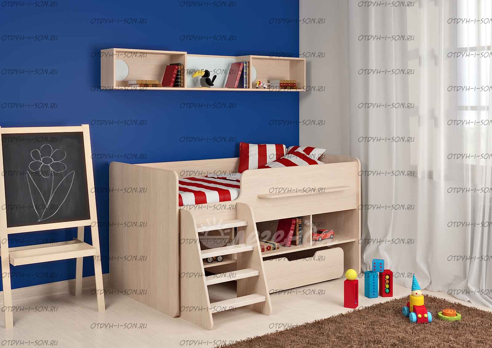 Кровать-чердак Сказка-6 Характеристики: Размер: 80Х160 см. Общие габариты ДхШхВ: 1645Х1255Х900 Корпус : ЛДСП, 16 мм. Высота изголовья: по запросу Высота изножья: по запросу Высота днища: по запросу Нестандарт: нет Вес: 91 кг. Объем: 0,230 м3 Цвет корпус: Ольха или Венге светлый; Цвет фасад: Венге светлый, венге темный, голубой лен, оранж, лайм, ольха, белый Предоплата: нет Комплектация: Кровать мини-чердак Лестница Полка для игрушек Подкроватный ящик Ламельное основание: нет Матрас: докупается отдельно