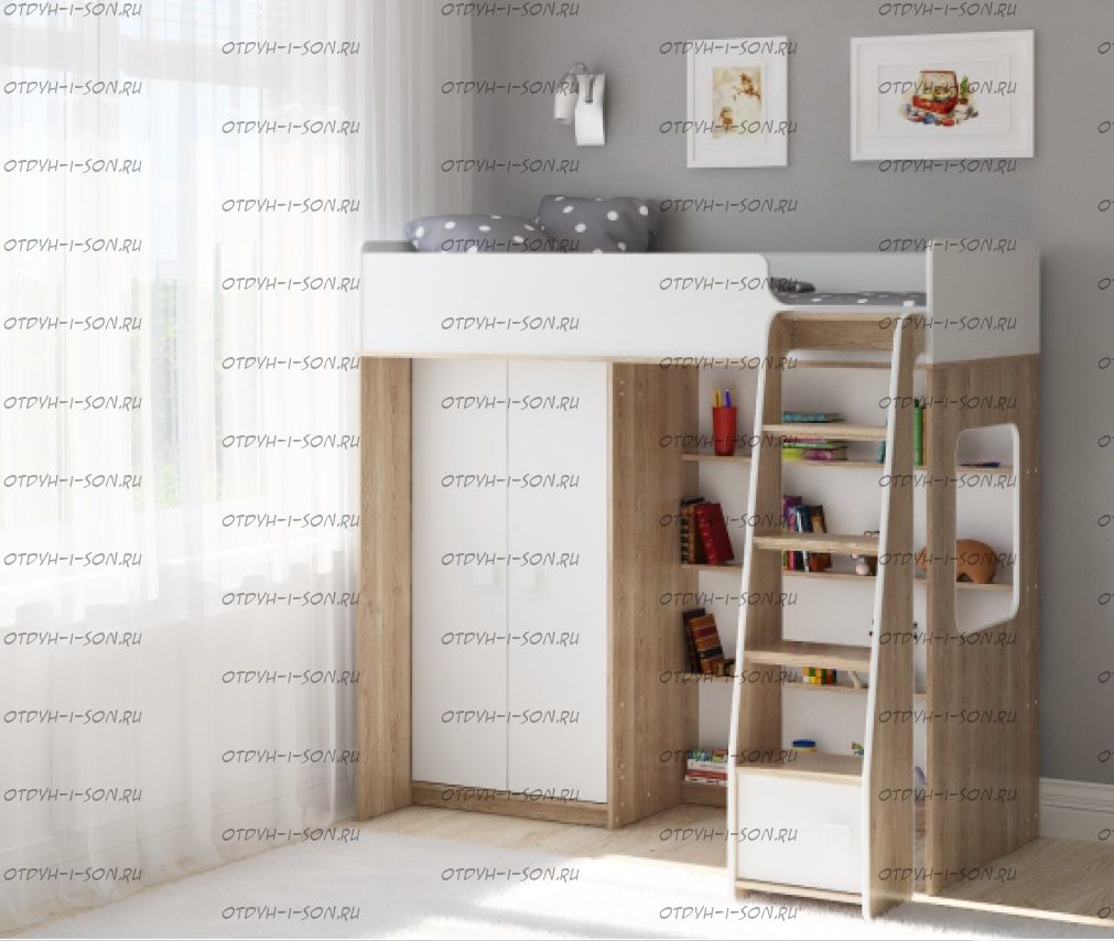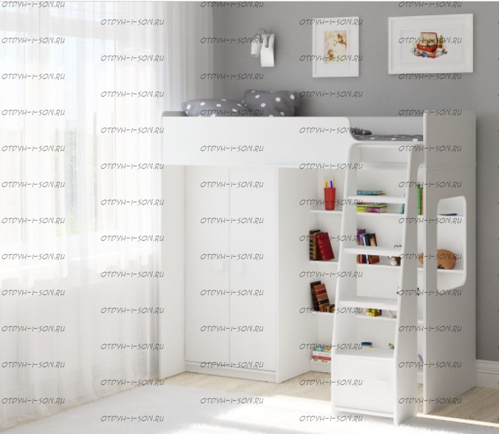 Кровать-чердак Легенда A601.1 Характеристики: Размер спального места: 75х175 Внешние габариты (ШхДхВ): 116,2 х 179 х 167,7 По Вашему выбору комплект может быть собран как на левую, так и на правую сторону. Цвета: белый или сонома-светлый/белый
