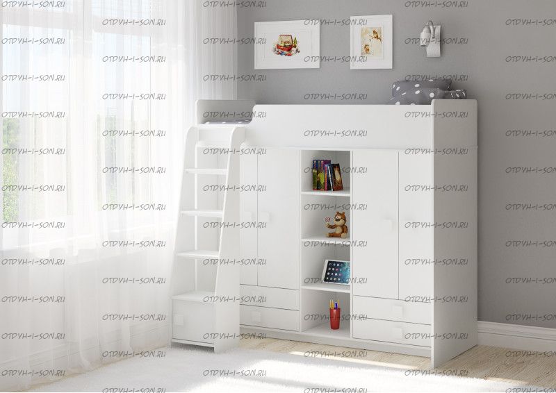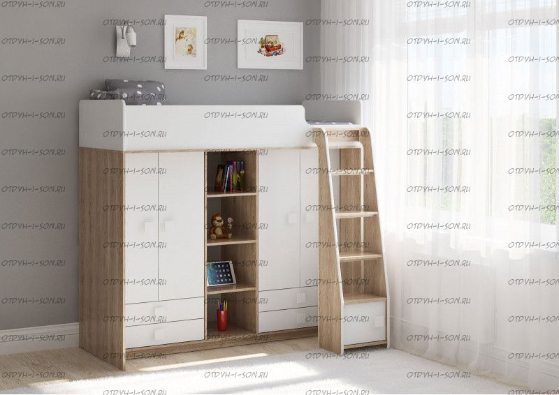 Кровать-чердак Легенда E603.1 Характеристики: Размер спального места: 75х175 или 75х190 Внешние габариты (ШхДхВ): 80,2 х 224,6 х 167,7 По Вашему выбору комплект может быть собран как на левую, так и на правую сторону. Цвета: белый или сонома-светлый/белый