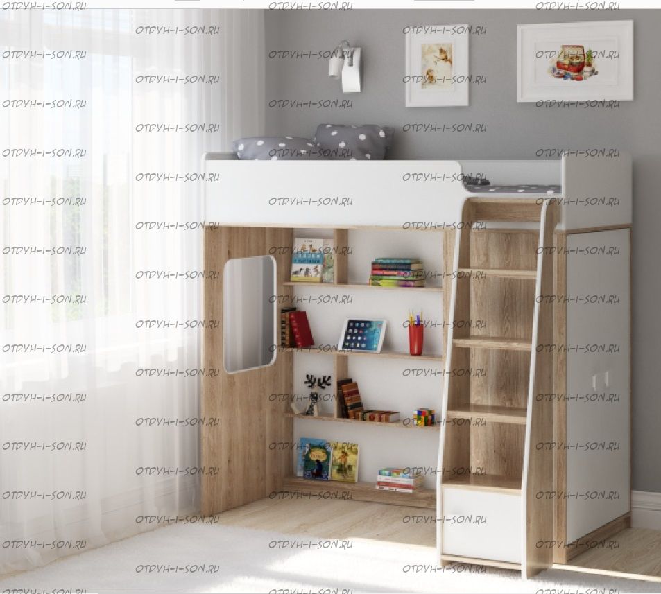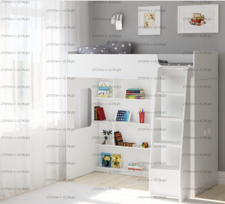 Кровать-чердак Легенда F601.1 Характеристики: Размер спального места: 75х175 или 75х190 Внешние габариты (ШхДхВ): 116,2 х 179 х 167,7 По Вашему выбору комплект может быть собран как на левую, так и на правую сторону. Цвета: белый или сонома-светлый/белый