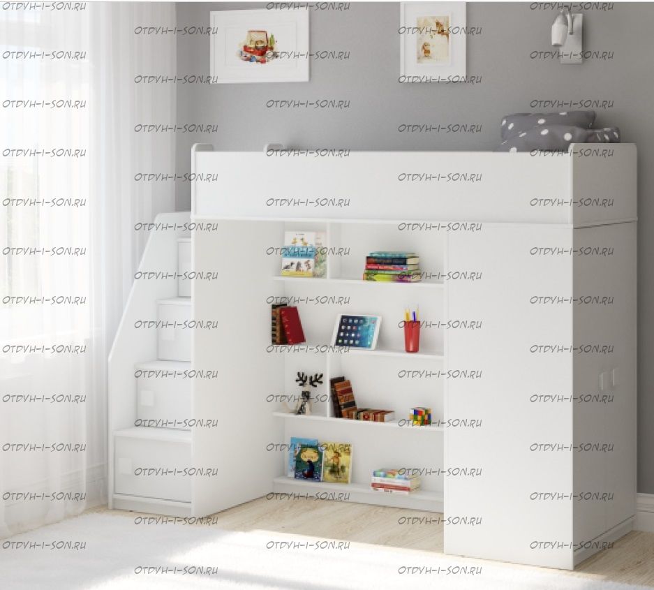 Кровать-чердак Легенда F602.3 Характеристики: Размер спального места: 75х175 или 75х190 Внешние габариты (ШхДхВ): 80,2 х 224,6 х 167,7 По Вашему выбору комплект может быть собран как на левую, так и на правую сторону. Цвета: белый или сонома-светлый/белый