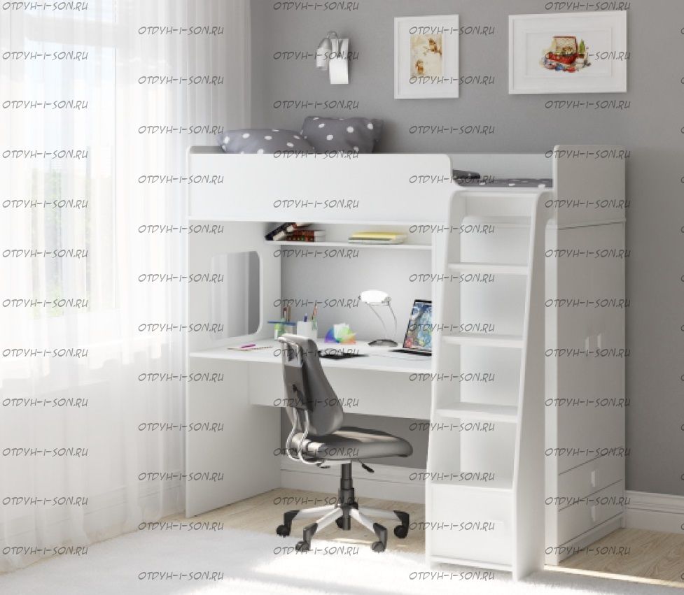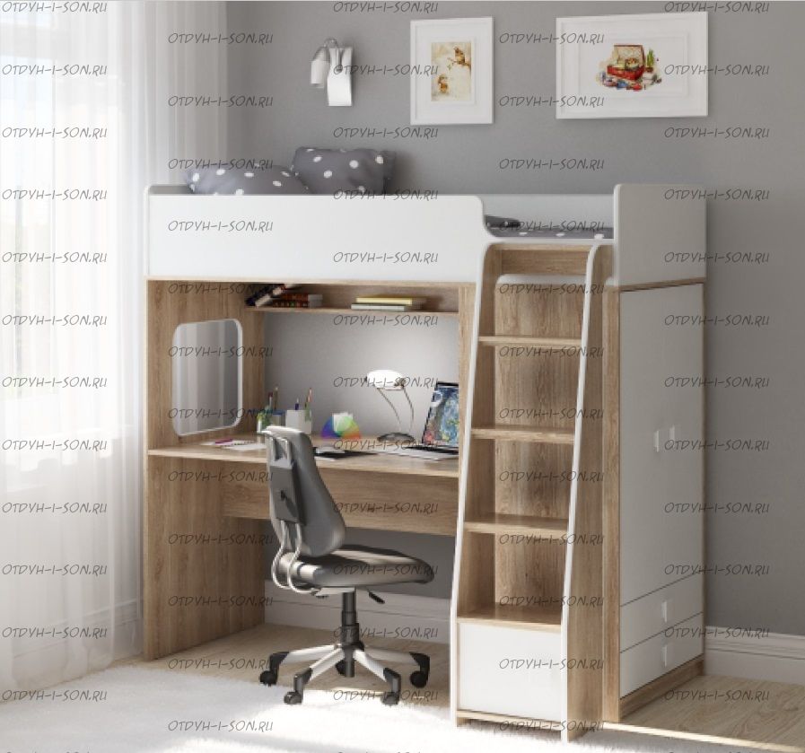 Кровать-чердак Легенда F607.1 Характеристики: Размер спального места: 75х175 или 75х190 Внешние габариты (ШхДхВ): 116,2 х 179 х 167,7 По Вашему выбору комплект может быть собран как на левую, так и на правую сторону. Цвета: белый или сонома-светлый/белый