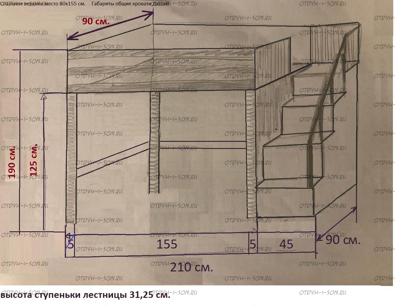 Кровать-чердак Лейла Кадет №7 Характеристики: Размер спального места: 80х160, 80х170, 80х180, 90х160, 90х180, 90х190, 90х200 см. и любые другие по Вашему запросу Общая высота: Высота царги: Габаритные Размеры: Характеристика выкатных ящиков: Комплект состоит из 2х ящиков; Мебельная фанера/ Массив дерева; Ящики на роликах; Дно ящика 5мм ДВП; Ящик двигается по полу. К кровати не фиксируется, установка с любой стороны. Масса в упаковке: Объем в упаковке: Материал: массив сосны В базовом варианте с тыльной стороны ящиков декоративной планки не предусмотрено Основание под матрас реечное Внимание: для любой модели кровати ВМК Шале возможно увеличение высоты бортиков кровати! Цвет: орех, бук, венге, груша, дуб, каштан, клен, красное дерево, махагон, ольха, сосна, белый (эмаль), слоновая кость (эмаль)