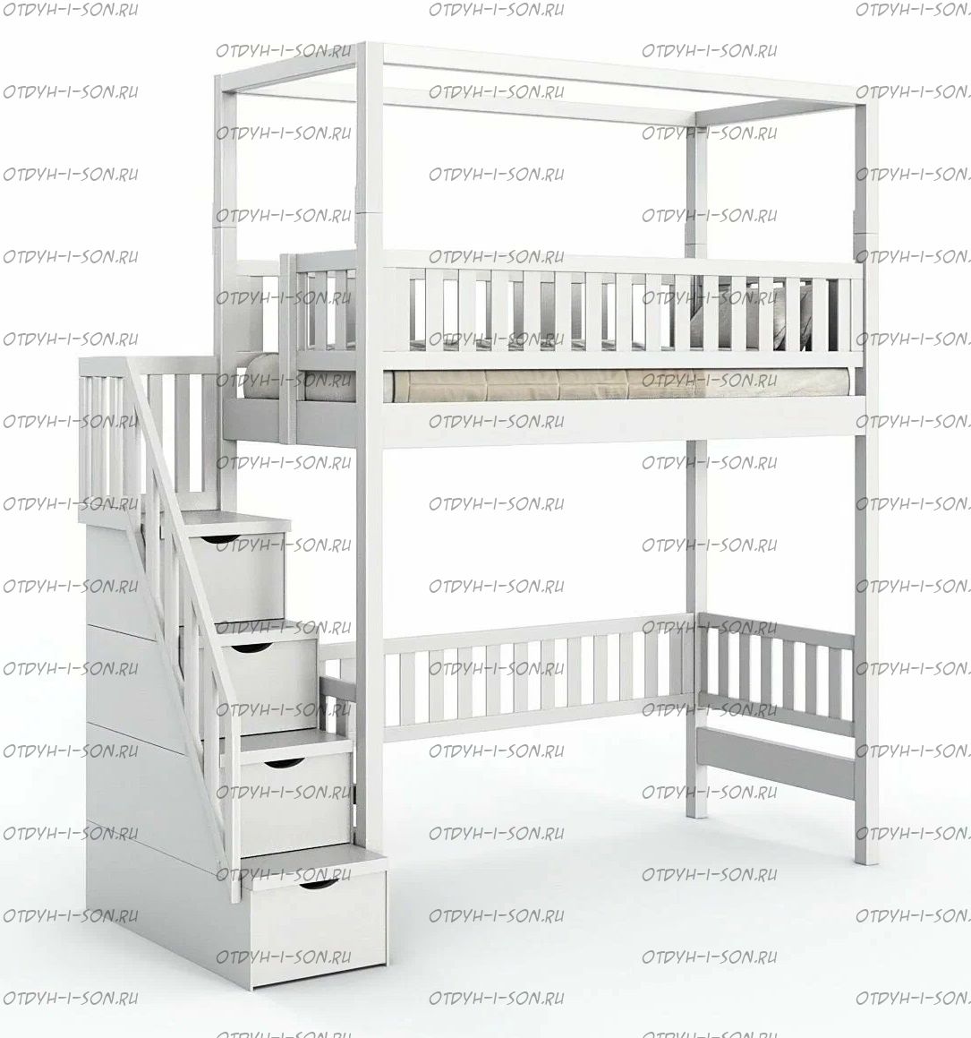 Кровать-чердак Лейла Sky №201,, любые размеры Характеристики: Размер спального места на выбор: 70х170, 70х180, 80Х180, 80Х190, 80Х200, 90Х180, 90Х190, 90Х200, 100х190, 100х200 см. и любые другие Габаритные размеры кровати: +8 см. к ширине, +53 см. к длине. (спального места) Глубина утапливания матраса: 5-6 см. (уточняйте у оператора) Материалы: сосна и мебельная фанера. Также возможно изготовление мебели из массива дуба, бука, ясеня. Возможно изготовление кроватей любых габаритных размеров. Крепление узлов кровати: специальные кроватные стяжки, саморезы, мебельный крепеж, пластиковые заглушки в цвет изделия. Боковые царги кровати закрепляются к спинкам при помощи надежных кроватных стяжек, которые не видны снаружи. Вес в упаковке: Объём в упаковке: Кол-во мест: Цвет: орех, бук, венге, груша, дуб, каштан, клен, красное дерево, махагон, ольха, сосна, белый (эмаль), слоновая кость (эмаль)