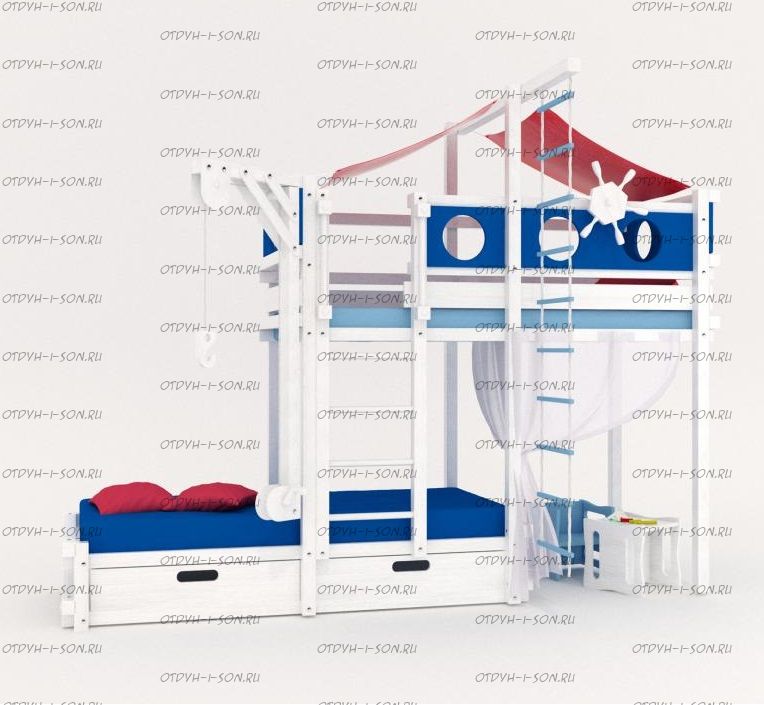 Кровать-чердак Пиратский корабль массив №KV Характеристики: Размер спального места: любой по Вашему пожеланию. Внешние габариты (ШхГхВ): +10-15 см к ширине и длине спального места кровати Цвет (морилка): беленый дуб, средний орех, сосна (натуральный), венге, светлый орех, ольха, орех, бук, красное дерево, клен красный, груша Цвет (эмаль) (+20 % от стоимости): фисташковый, белый, черный, темно-зеленый, слоновая кость (белый в бежевый), сиреневый, синий, светло-зеленый, розовый, красный, желтый, дуб молочный (белый в розовый), голубой Производство Владимирской мебельной фабрики, кровать доставляется напрямую от производителя, самовывоз ограничен.