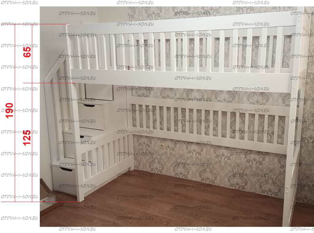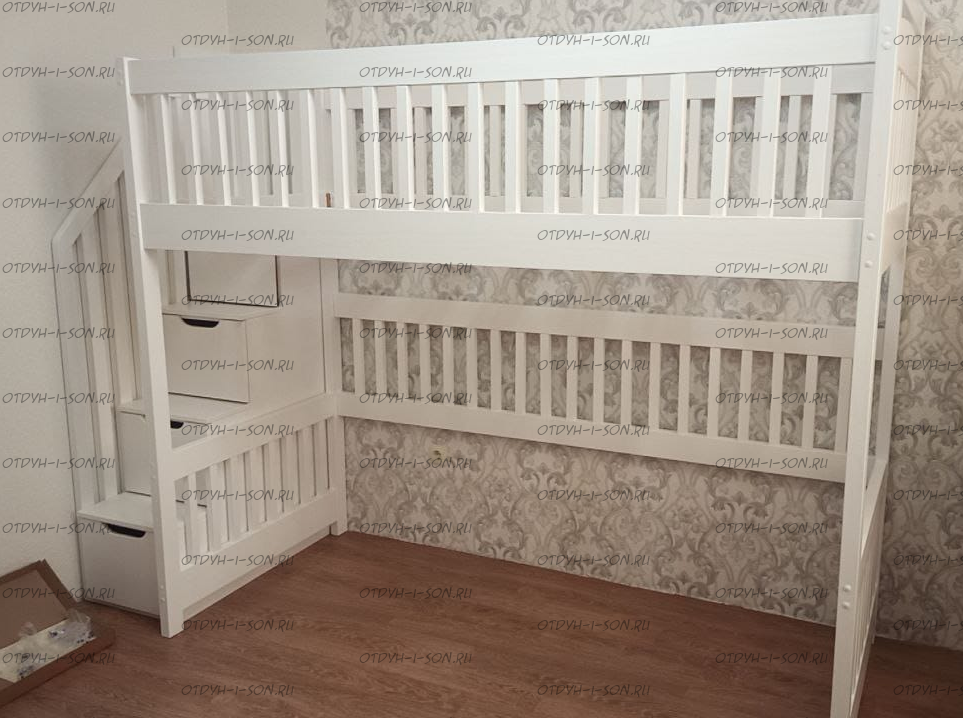 Кровать-чердак Радуга Классика №В со стандартной лестницей Характеристики: Размер спального места: 80х160, 80х170, 80х180, 90х160, 90х180, 90х190, 90х200 см. и любые другие по Вашему запросу Общая высота: Высота царги: Габаритные Размеры: Характеристика выкатных ящиков: Комплект состоит из 2х ящиков; Мебельная фанера/ Массив дерева; Ящики на роликах; Дно ящика 5мм ДВП; Ящик двигается по полу. К кровати не фиксируется, установка с любой стороны. Масса в упаковке: Объем в упаковке: Крепления кроватей фабрики ВМК Шале: мебельные стяжки, евроболты, заглушки Материал: массив сосны В базовом варианте с тыльной стороны ящиков декоративной планки не предусмотрено Основание под матрас реечное Внимание: для любой модели кровати ВМК Шале возможно увеличение высоты бортиков кровати! Цвет: орех, бук, венге, груша, дуб, каштан, клен, красное дерево, махагон, ольха, сосна, белый (эмаль), слоновая кость (эмаль)