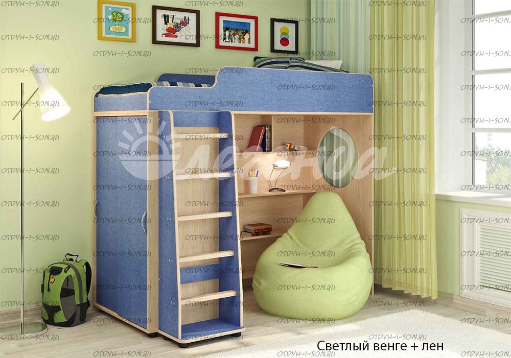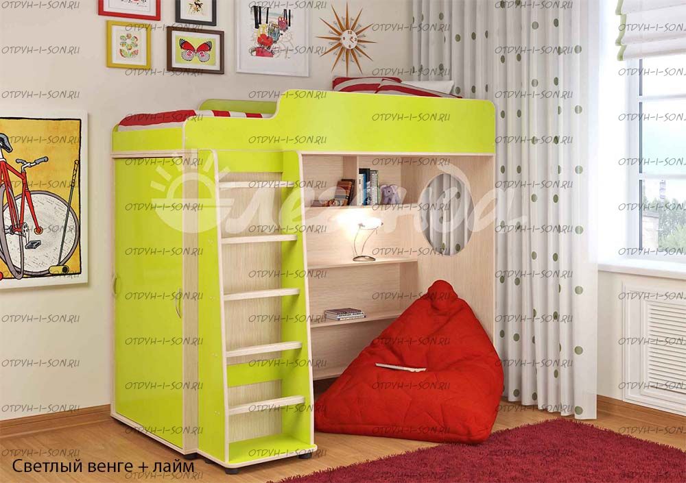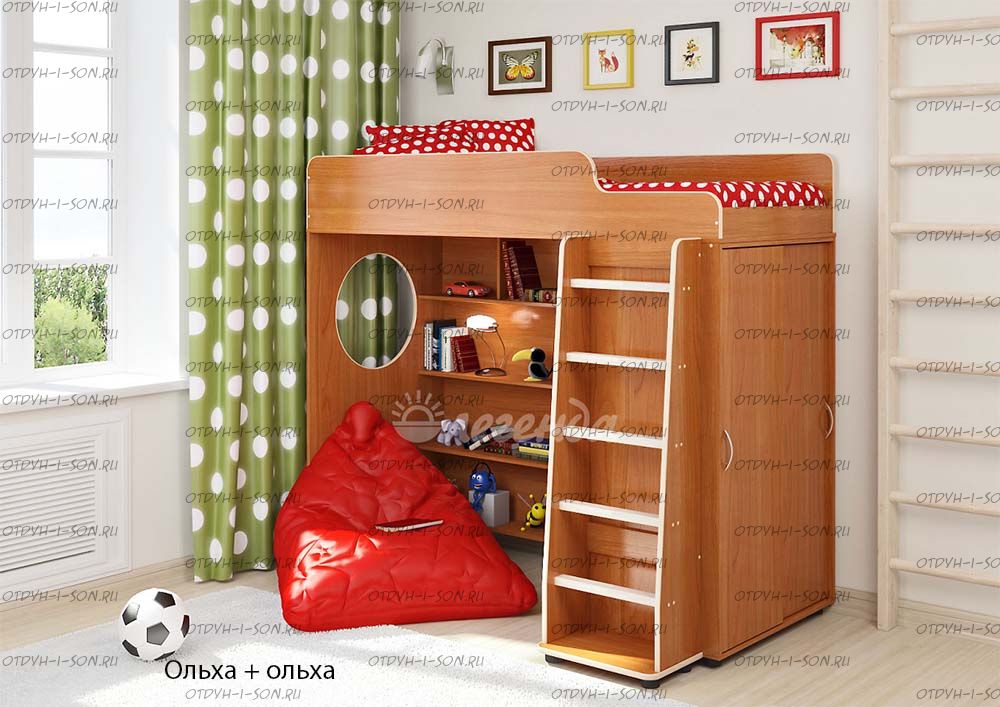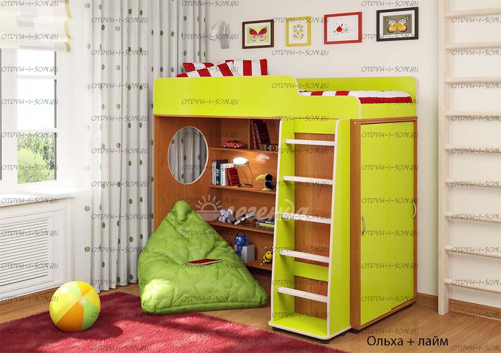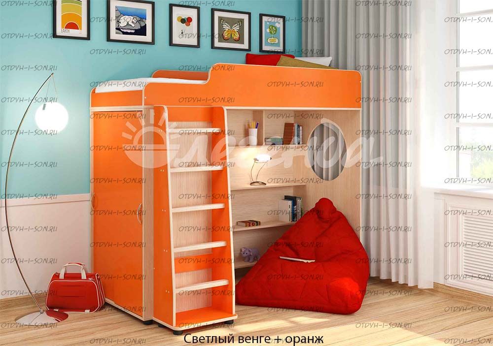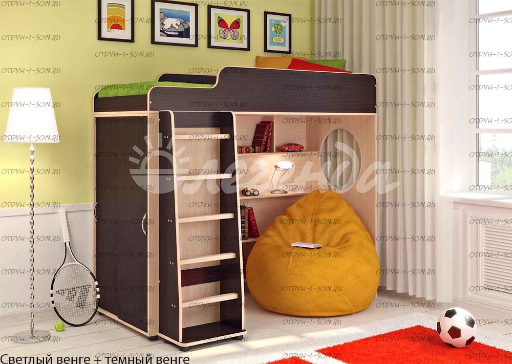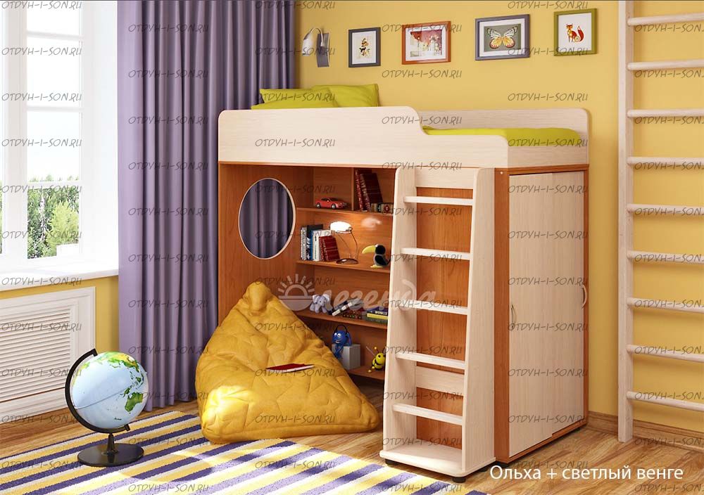 Кровать-чердак Легенда-5.1 Комплектация: Кровать-чердак Л-5 (со шкафом) Лестница прямая ЛП-04 Характеристики: Габариты: 1952Х846Х1716 мм Спальное место: 80Х190см Высота борта: 30см Ширина лестницы: 45см Рекомендуемая высота матраса: 5-15см Вес: 146 кг. Объем: 0,33 м3 Мебель универсальная, может быть собрана в лево- или правостороннем варианте. Цвет корпуса: ольха, венге светлый Цвет фасада: венге светлый, ольха, венге темный, голубой, оранжевый, розовый, лайм