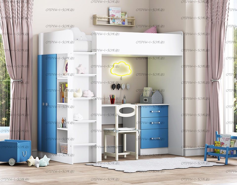 Кровать-чердак Стува-Теремок. Кровать-чердак является универсальной, так как направление кровати определяется при сборке. Комплектация: Кровать-чердак со спальным местом: 90Х190 см. Уточняйте у оператора. Матрац 90Х190 см. Характеристики: Размер спального места: 90Х190 см. Размер детской комнаты (ШхГхВ): Толщина матраца рекомендуется 8-12 см. Упаковка: Вес: Объем: Цвета корпуса: дуб молочный, дуб сонома, венге, орех Цвета фасадов: ольха, оранжевый, орех, дуб молочный, голубой, салатовый, крем ваниль, розовый, салатовый, венге, зеленый текстиль, желтый