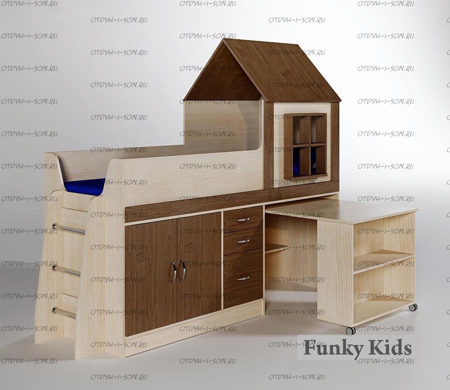 Кровать-чердак со столом Фанки Кидз Домик, арт. 10/2. Детская кровать-чердак 10/2 Фанки Кидз Домик на странице представлена функциональной конструкцией с выкатным письменным столом, который на колесиках задвигается под верхнее спальное место (190х80 см), двухдверным шкафом с полками и пеналом с выдвижными ящиками разной глубины. Кровать выполнена в виде игрового модуля с надстройкой в изголовье, дизайн которой позволит сформировать в детской комнате непринужденную веселую атмосферу и собственный стиль, что будет выгодно отличать ее от интерьеров взрослых комнат.