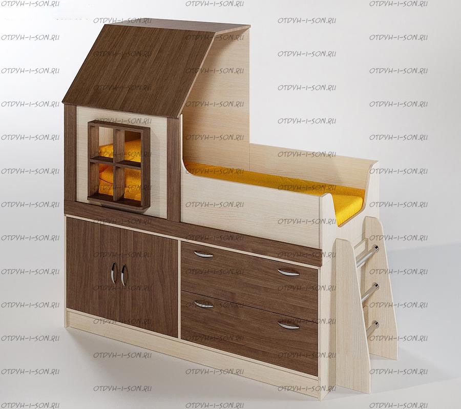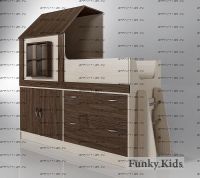 Кровать-чердак Фанки Кидз Домик, арт. 9/2 + лестница 13/54. Кровать Фанки Кидз Домик, арт. 9/2 с лестницей 13/54 для одного ребенка производится в виде домика с чердачком в изголовье, в которой предусмотрены крыша и стенка с большом окном. Спальное место имеет размер 160х70 см и лист лдсп в основании. Верхний ярус оборудован бортиками по бокам и выпилом с торцевой стороны для спуска. В качестве лестницы можно использовать невысокую устойчивую тумбу с ящиками 13/19 (приобретается отдельно). Внизу конструкции есть двухдверный шкаф с полкой внутри и два выдвижных ящика одинаковой глубины для хранения белья и одежды.