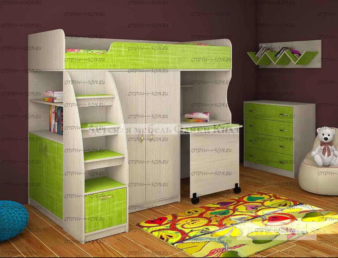 Кровать-чердак Фанки Кидз-18/2 СВ. Кровать может собираться как на левую сторону, так и на правую сторону. Характеристики: Размер спального места: 80х190 Внешние габариты: 832х1932х1640 Материал: ЛДСП 16 мм (Австрия, Egger). Цвет корпуса: ольха, дуб кремона, сосна лоредо, венге, орех Цвет фасада: розовый, крем ваниль, оранжевый, зеленый, файнлайн крем, голубой, венге, дуб кремона, ольха, орех Комплектация: кровать чердак 18 полка 13/11 комод 13/5