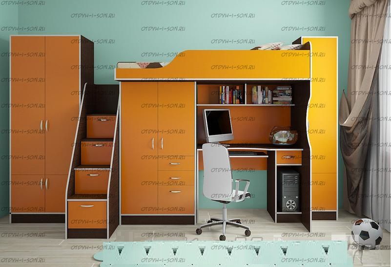 Кровать-чердак Фанки Кидз 4/7 СВ Характеристики: Размер спального места: 80х190 Внешние габариты: Д 2332хВ 1890 Материал: ЛДСП 16 мм (Австрия, Egger). Цвет корпуса: ольха, дуб кремона, венге, орех Цвет фасада: розовый, крем ваниль, оранжевый, зеленый, голубой, венге, дуб кремона, ольха, орех Комплектация: Кровать чердак Фанки Кидз-4 Лестница-комод Фанки Кидз-13/8СВ Шкаф 1 дверный Фанки Кидз-13/10СВ Шкаф двухдверный Фанки Кидз-13/2СВ