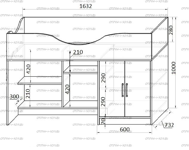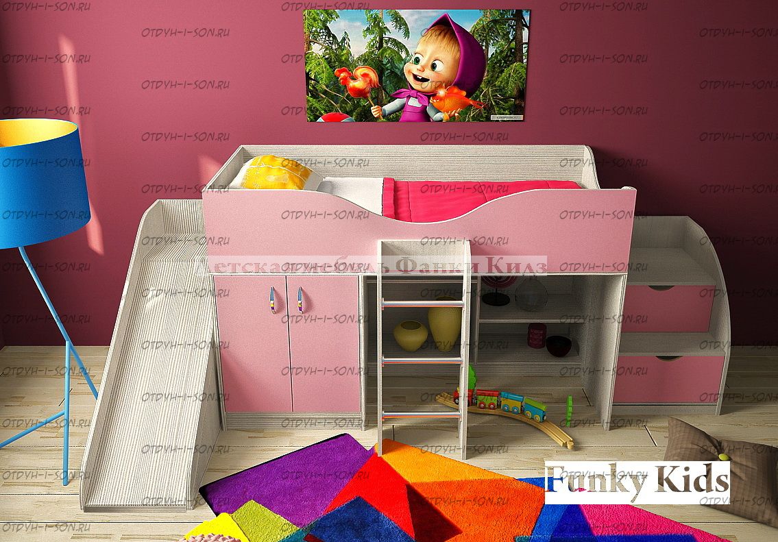 Кровать-чердак Фанки Кидз-6.2 Комплектация: Кровать чердак Фанки Кидз-6, габариты (ШхДхВ): 732х1632х1280 мм. Лестница-комод малая 13/19СВ, габариты (ШхГхВ): 400 х 835 х 810 мм. Горка 13/18СВ, габариты (ШхГхВ): 400 х 1200 х 800 мм. Характеристики: Размер спального места: 70х160 Внешние габариты: 732х1632х1280 Материал: ЛДСП 16 мм (Австрия, Egger). Лестница: В956 х Г250 х Ш350 мм. Цвет корпуса: белый, ольха, дуб кремона, венге, орех Цвет фасада: белый, розовый, крем ваниль, оранжевый, зеленый, голубой, венге, дуб кремона, ольха, орех