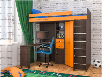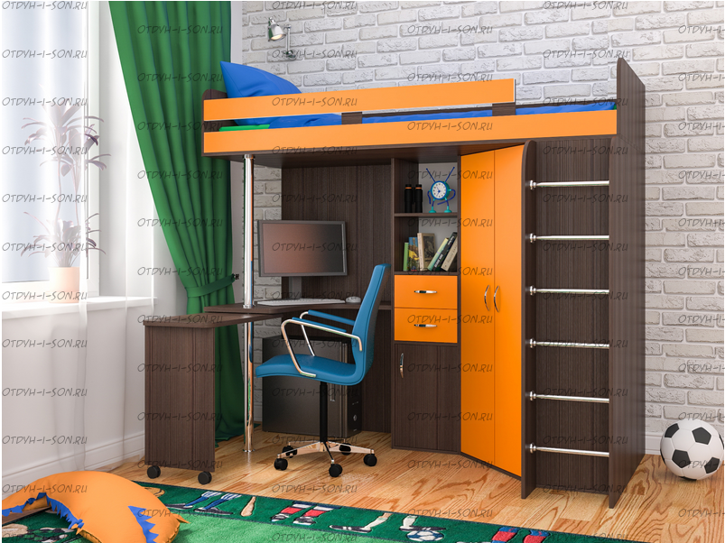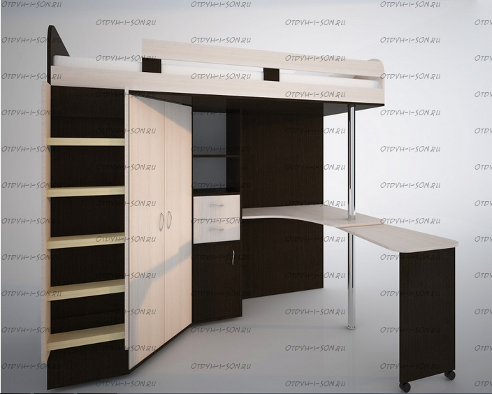 Кровать-чердак Юниор-3 стильная и функциональная двухъярусная кровать для ваших детей, выполненная из качественных и натуральных материалов. Такая детская мебель является максимально удобной и функциональной, соединяя в оригинальный комплект большое спальное место, удобное место для уроков и большой шкаф для одежды.