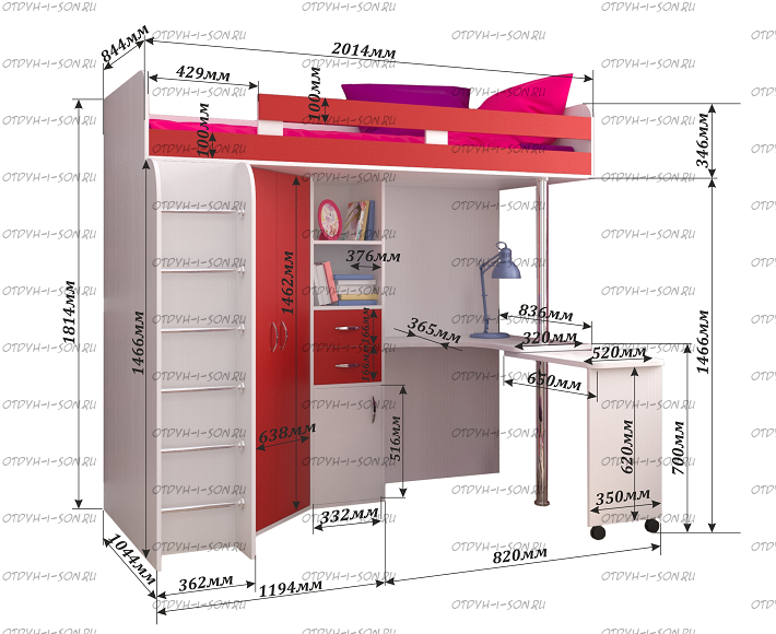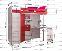 Кровать-чердак Юниор-3 Характеристики: Размер спального места: 80х200 см Габаритные размеры (ШхГхВ): 2050х1040х1800 мм Пенал: 1510х370х370 мм Шкаф угловой: 1510х840х840 мм Стол стационарный: 840х840 мм Стол выкатной: 650х520 мм Материалы: кромка АБС Цвет корпуса: дуб молочный, венге, вишня, орех донской, белое дерево, бодего темный Цвета фасада: розовый, оранжевый, ирис, лайм, голубой, зеленый, бежевый, красный, бодего темный, дуб молочный, венге, вишня, орех донской, белое дерево.