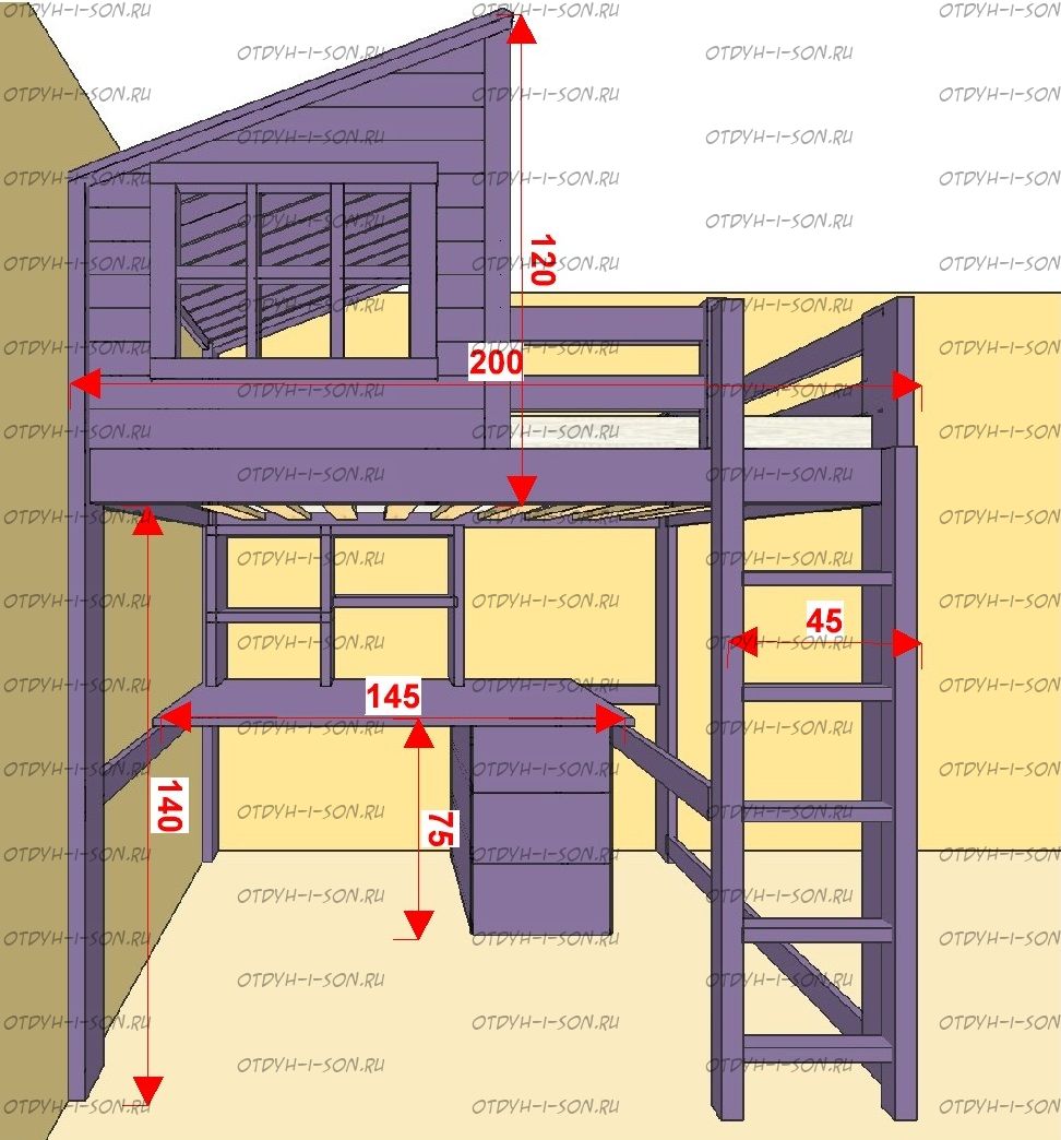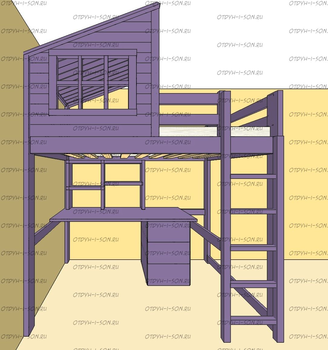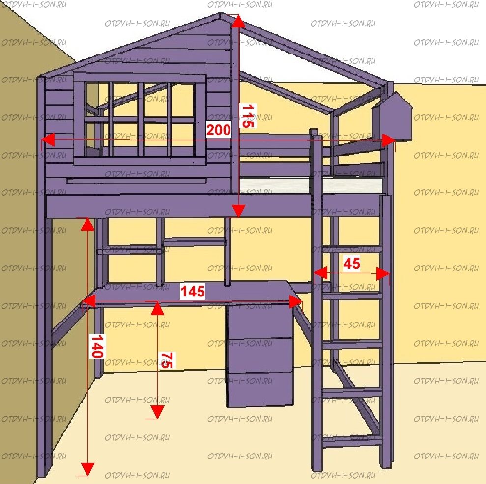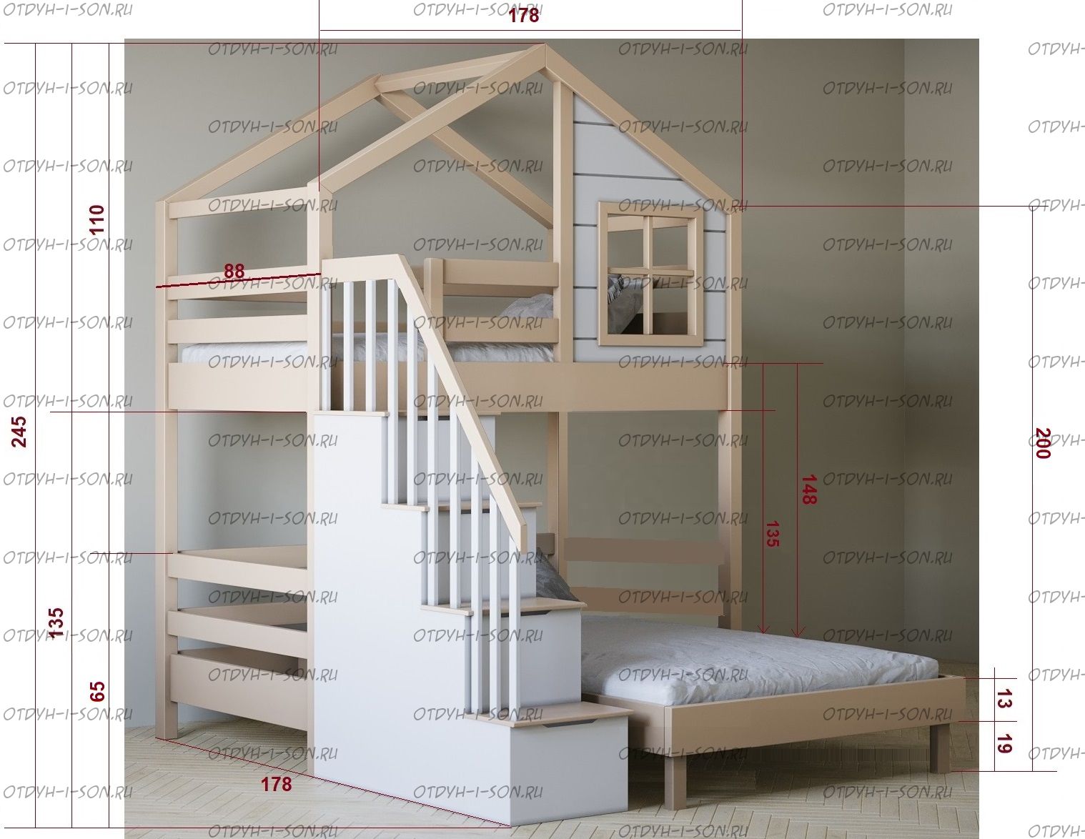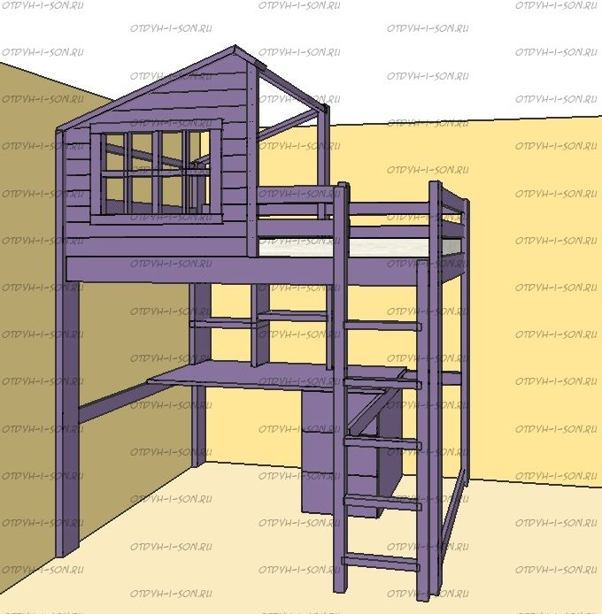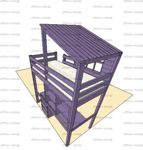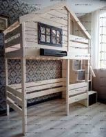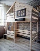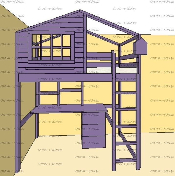 Кровать-чердак домик Roof Комплектация: Кровать-чердак Домик Лестница-тумба Характеристики: •Размеры спального места: 80х160 см.,90х180 см.,90х200 см.и любые другие •Внешние размеры кровати при размере спального места 90х200 (ШхГхВ): •Внешние размеры кровати с лестницей-комодом сп.место 90х200 (ШхГхВ): •Габаритные размеры: любые •Материалы: массив сосны •Цвет покрытия: любая цветовая гамма (таблица палитры Ral);