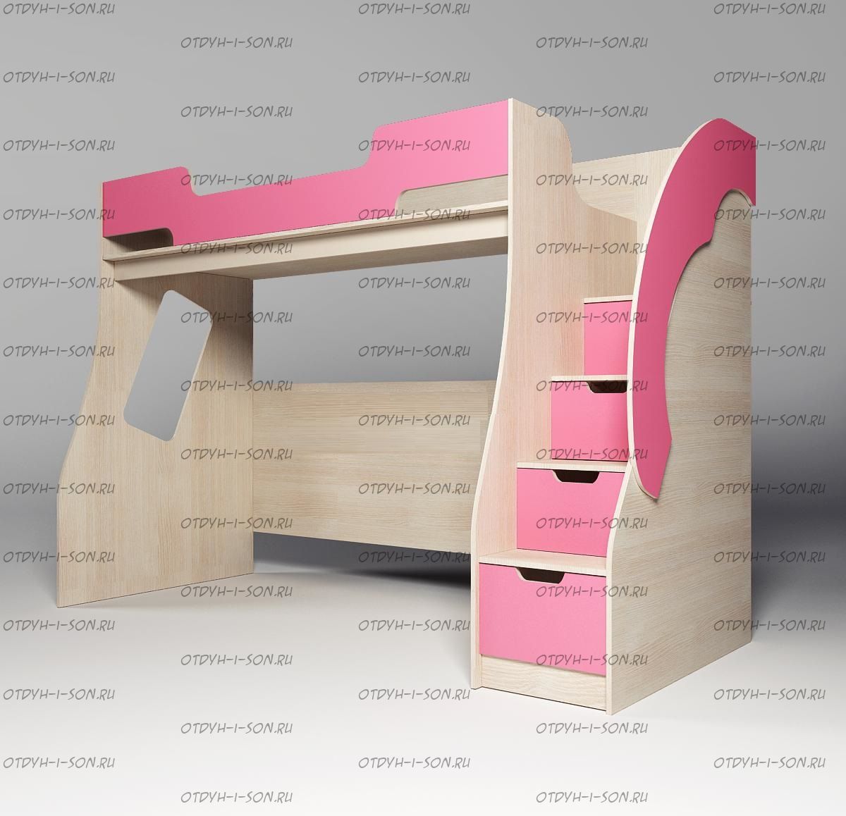 Кровать-чердак с диваном и с рабочей зоной Фанки Кидз 23 Комплектация: Кровать чердак с нишей Фанки Кидз 23/1 (ШхГхВ): 2432х1014х1720 мм. Раскладной диван-кресло Бланес-2 (ШхГхВ): 1300х980х970 мм. Стол узкий Фанки Кидз 23/2 (ШхГхВ): 596х650х730 мм. Характеристики: Размер спального места: 80х200 + 120х170 см. Внешние габариты: 2432х1014х1720 мм. Высота от пола до верхнего спального места 140 см. Диван: Ш 100 см. Стол: Ш 59,6 х В 73 х Г 65 см. Пенал: Ш 39,6 х В 131 х Г 52 см. Вес:264.5кг, Объём:1.031м3 Материал: ЛДСП 16 мм (Австрия, Egger). Цвет корпуса: Ольха, Венге, Орех, Дуб кремона Цвет фасада: Розовый, Оранжевый, Крем ваниль, Салатовый, Дуб кремона, Голубой, Венге, Ольха, Орех
