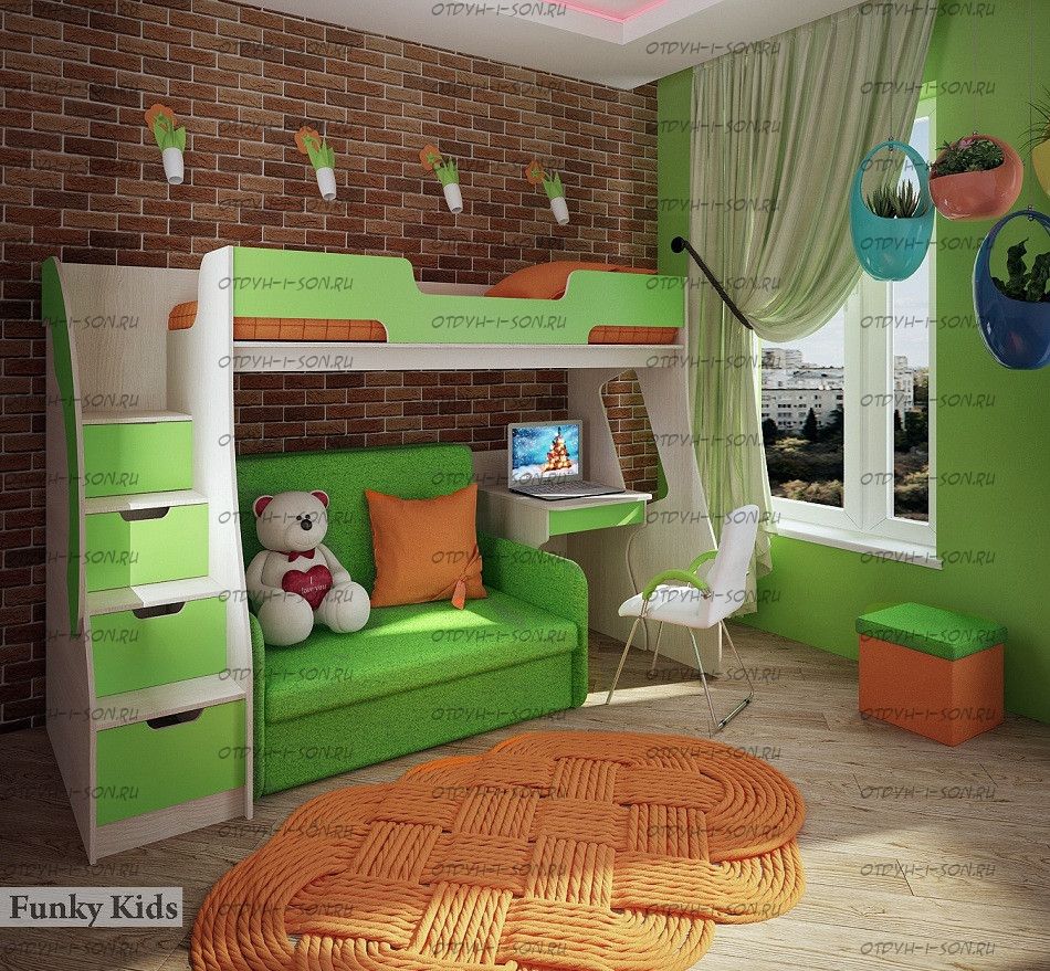 Кровать-чердак с диваном и с рабочей зоной Фанки Кидз 23. Композиция представленная на фото это кровать чердак Фанки Кидз 23 с диваном и с рабочей зоной. Такое решение поможет правильно организовать пространство в детской комнате. Диван раскладывается вперед и получается спальное место шириной 118 см, где комфортно может разместиться мама с ребенком. Разнообразная палитра ткани позволит сделать выбор на любой вкус. Диван имеет небольшой ящик для хранения вещей.