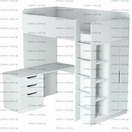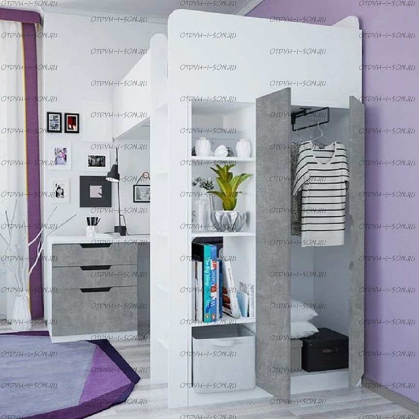 Кровать-чердак Polini Simple с письменным столом и шкафом стильная и функциональная двухъярусная кровать для ваших детей, выполненная из качественных и натуральных материалов. Такая детская мебель является максимально удобной и функциональной, соединяя в оригинальный комплект большое спальное место, удобное место для уроков и большой шкаф для одежды.