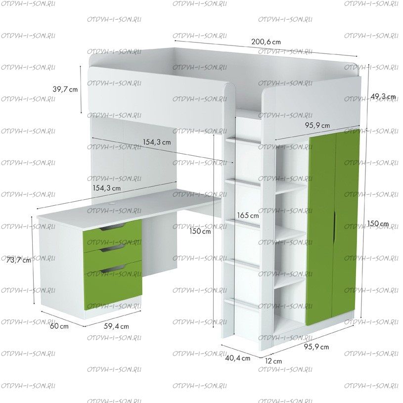 Кровать-чердак Polini Simple с письменным столом и шкафом Характеристики: Размер спального места: 90х200 см Габаритные размеры (ДхГхВ): 206 х 107 х 199 мм (уточняйте у оператора) Материалы: кромка АБС Вес, кг 194 Объем, м3 0.4