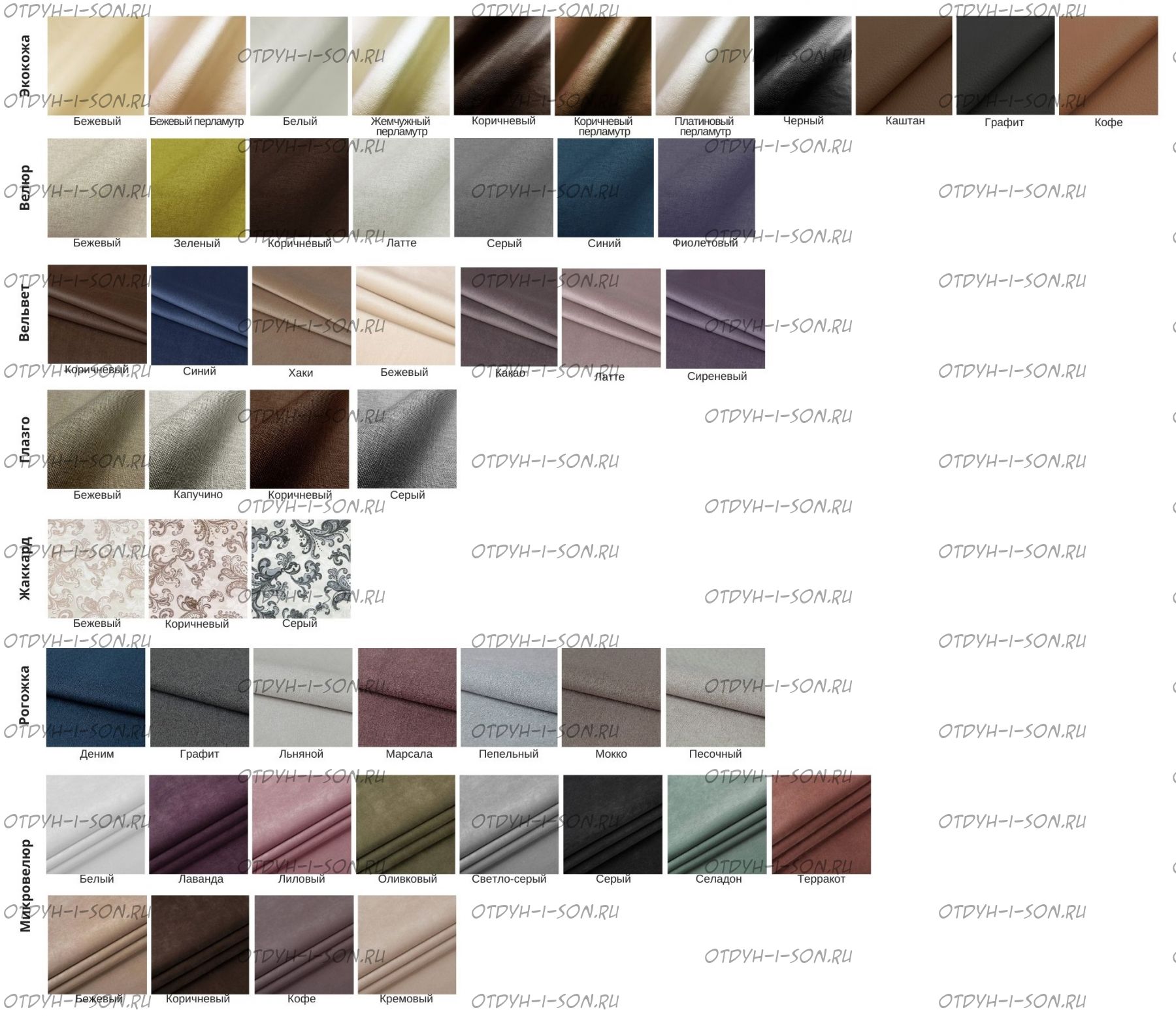 | Доступно в цветах | Материал обивки: Экокожа, рогожка, велюр, жаккард и т.п. (более 20 цветов) |