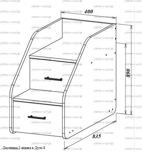 Лестница-комод приставная, 2 ящика к детской "Дуэт-8" Характеристики: Внешние габариты (ШхГхВ): 400х835х890 мм. Гарантия, год 2 Материал ЛДСП Ширина лестницы: Складская программа Вес: Объем: Цвет корпуса: яблоня, венге, орех, ольха, дуб молочный, бук. Цвет фасада: бук, яблоня, дуб молочный, венге, орех, ольха, ясень шимо светлый, ясень шимо темный, оранжевый, зозовый, синий, зеленый, ваниль. Любой цвет корпуса Вы можете скомбинировать с любым цветом фасада.