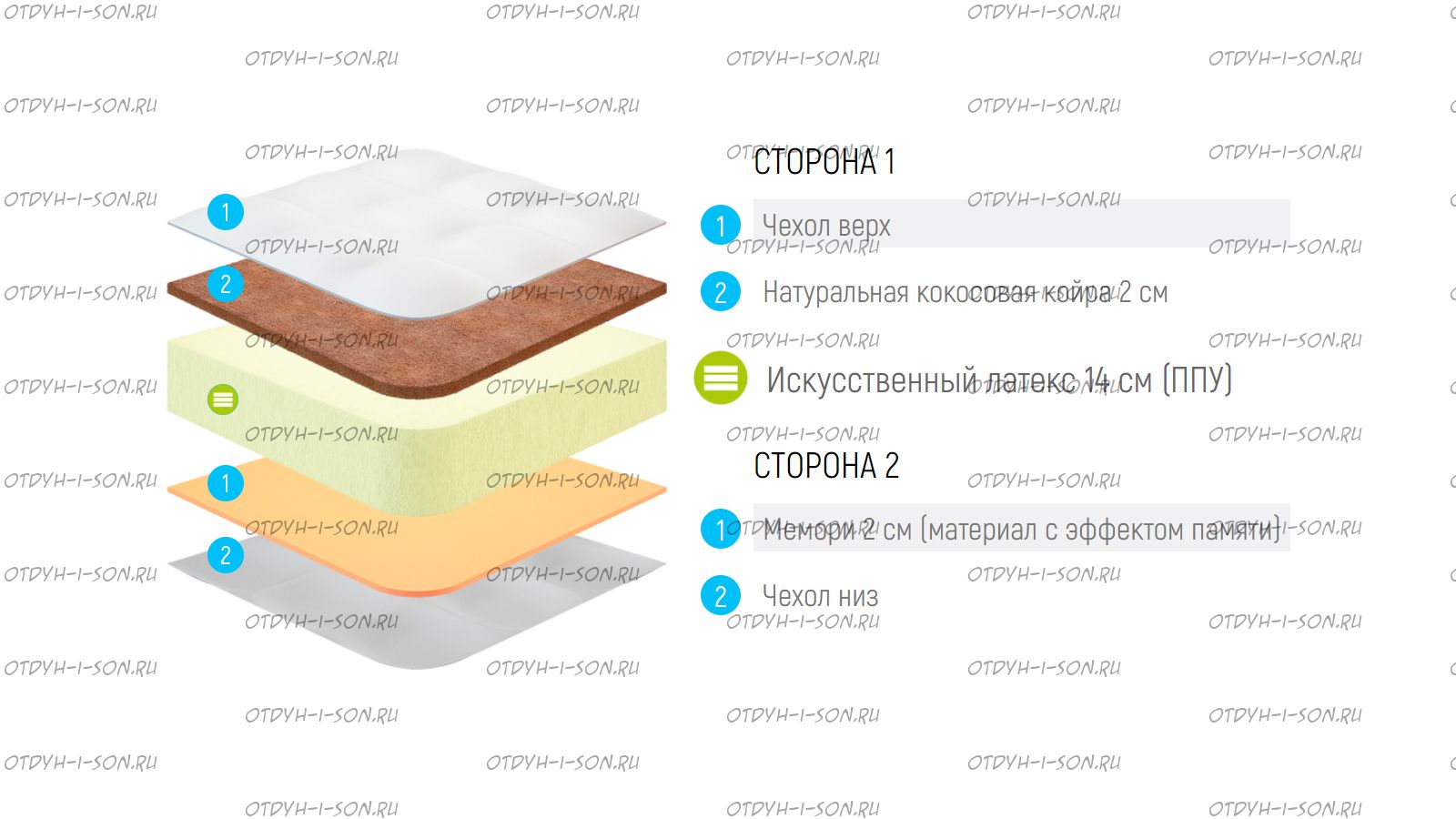 МАТРАС LONAX FOAM COCOS MEMORY 2 PLUS ВЫСОТА : 18 СМ КОЛ-ВО ПРУЖИН НА М²: БЕСПРУЖИННЫЙ ЖЕСТКОСТЬ (СТОРОНА 1): ЖЕСТКАЯ ЖЕСТКОСТЬ (СТОРОНА 2): МЯГКАЯ МАКСИМАЛЬНАЯ НАГРУЗКА : 120 КГ ТКАНЬ ЧЕХЛА (ПО УМОЛЧАНИЮ): ХЛОПКОВЫЙ ЖАККАРД (200 Г/М2) СТАНДАРТ ГАРАНТИЯ: 36 МЕСЯЦЕВ ОСНОВА: ИСКУССТВЕННЫЙ ЛАТЕКС 14 СМ (ППУ) СТРАНА ПРОИЗВОДИТЕЛЬ: РОССИЯ ТИП: БЕСПРУЖИННЫЙ ЖЕСТКОСТЬ: РАЗНОСТОРОНЯЯ