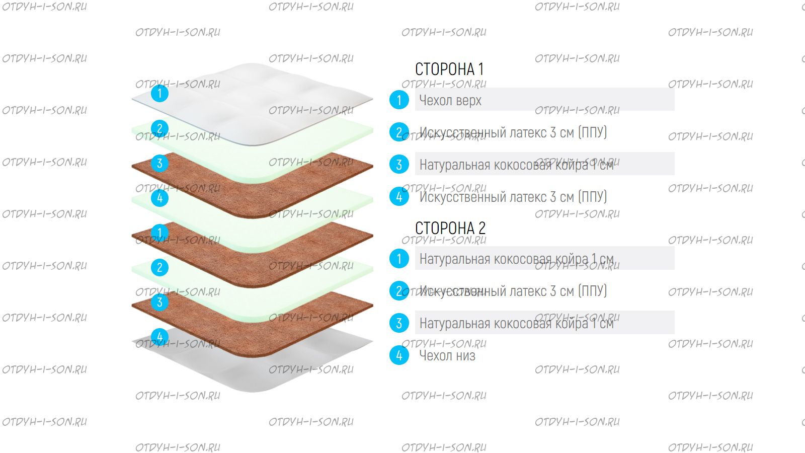 Основа матраса состоит из слоев вспененного пенополиуретана и кокосовых плит, расположенных поочередно, в виде сэндвича. За счет этого стороны отличаются между собой по жесткости.