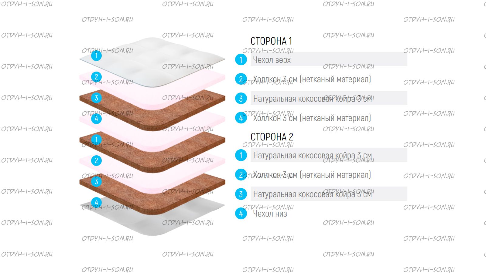 В качестве внутреннего наполнителя, отвечающего за уровень комфорта и степень жесткости, используется 3 слоя холлкона и 3 плиты натуральной кокосовой койры. Все прослойки расположены между собой поочередно, в виде сэндвича.