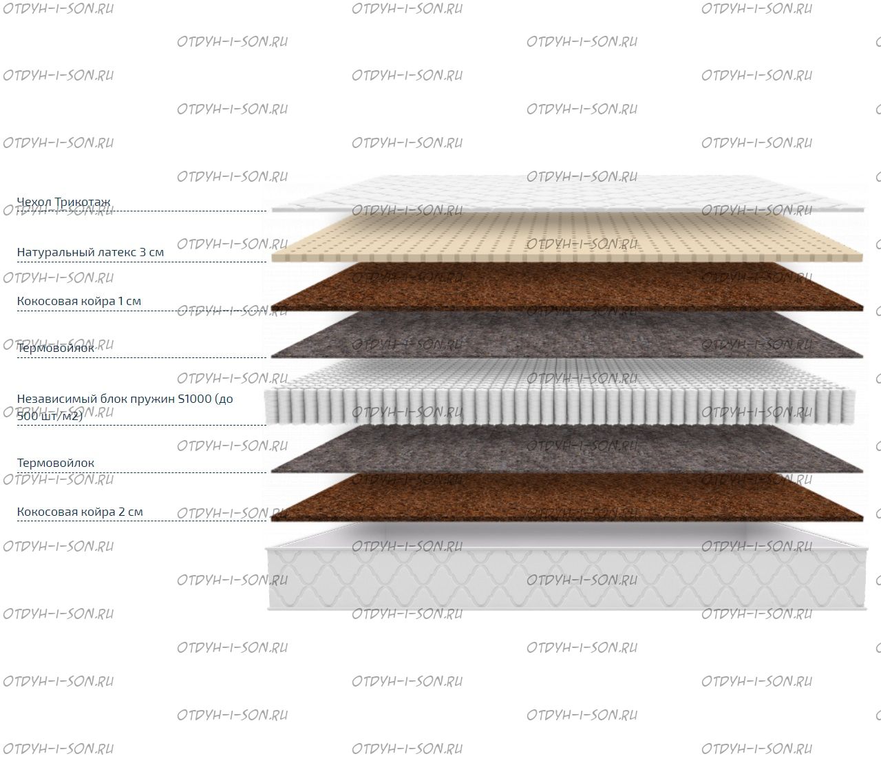 Матрас Димакс Мега Медиум хард 21 см. Независимые пружины Состав матраса по слоям: Чехол: Хлопковый Жаккард Кокосовая койра латексированная 20мм. Термовойлок Блок независимых пружин S1000 Термовойлок Кокосовая койра латексированная 10мм. Натуральный латекс 30мм. Чехол: Хлопковый Жаккард