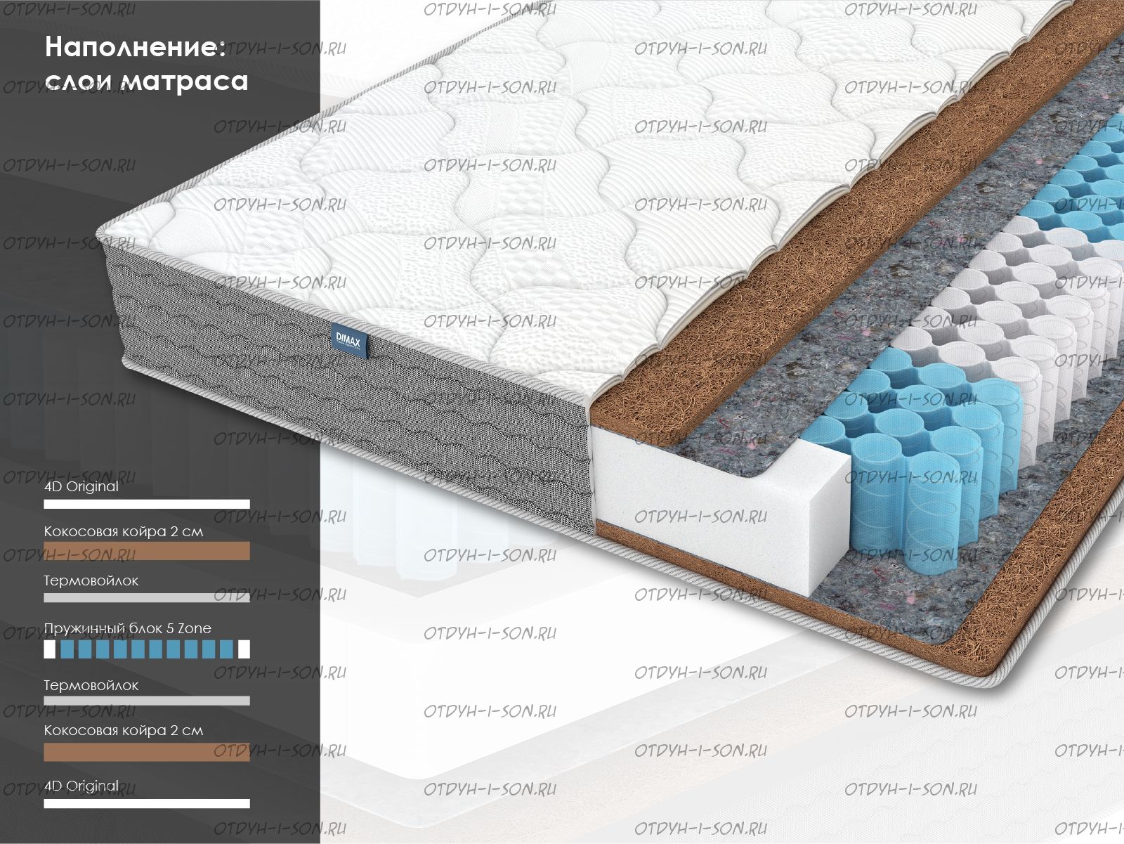 Матрас Димакс ОК Хард 19 см. Состав матраса по слоям: Чехол Жаккард Кокосовая койра 2 см Термовойлок Независимый блок пружин 5 зональный (до 256 шт/спальное место) или Независимый блок TFK (на выбор) Термовойлок Кокосовая койра 2 см Чехол Жаккард