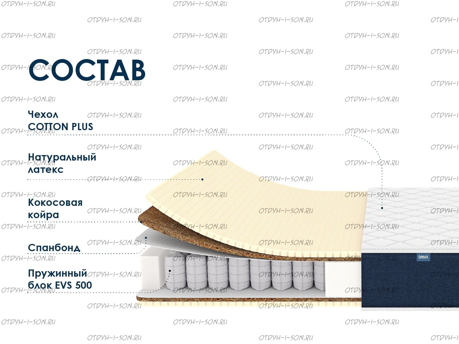 Матрас Димакс Практик Медиум 500 21 см. Независимые пружины Состав матраса по слоям: Чехол из хлопкового жаккарда Натуральный латекс 2 см Кокосовая койра 1 см Спандбонд Независимые пружины TFK (до 256 шт/м2) Спандбонд Натуральный латекс 1 см Кокосовая койра 2 см Чехол из хлопкового жаккарда