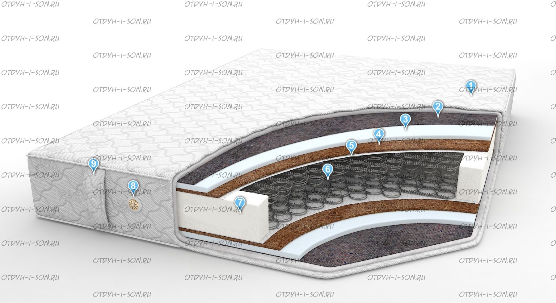 Матрас Идеал Сингл Плюс BS Высота матраса: 20 см. Состав матраса по слоям: Жаккард, стеганный на синтепоне Пенополиуретан 20 мм Кокос 10 мм Спанбонд Пружинный блок Боннель Кокос 10 мм Пенополиуретан 20 мм Жаккард, стеганный на синтепоне ППУ по периметру