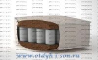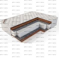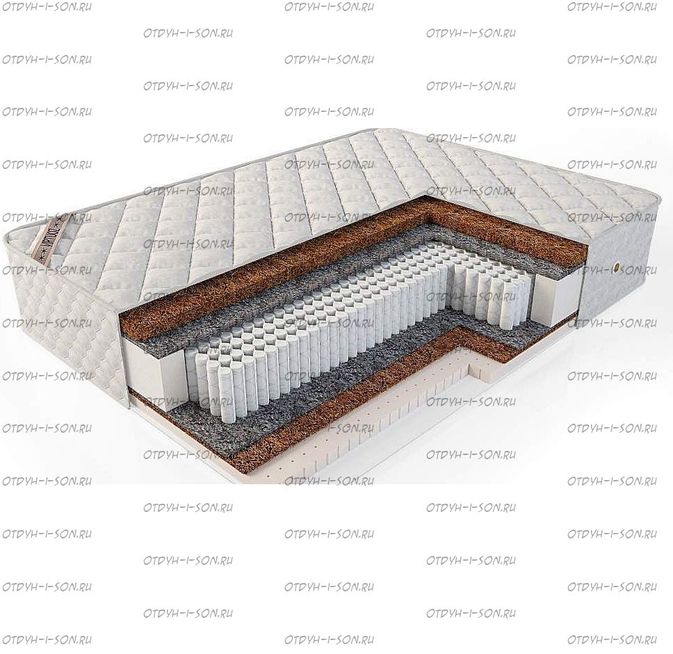 Состав матраса по слоям: Чехол: хлопковый жаккард простеганный на холлофайбере Кокосовая койра латексированная 30мм Термовойлок на упрочненной основе. Пружинный блок Мультипокет S1000 (520 шт/кв.м ) Термовойлок на упрочненной основе Кокосовая койра латексированная 30мм. Чехол: хлопковый жаккард простеганный на холлофайбере