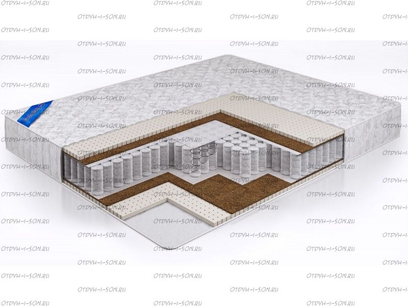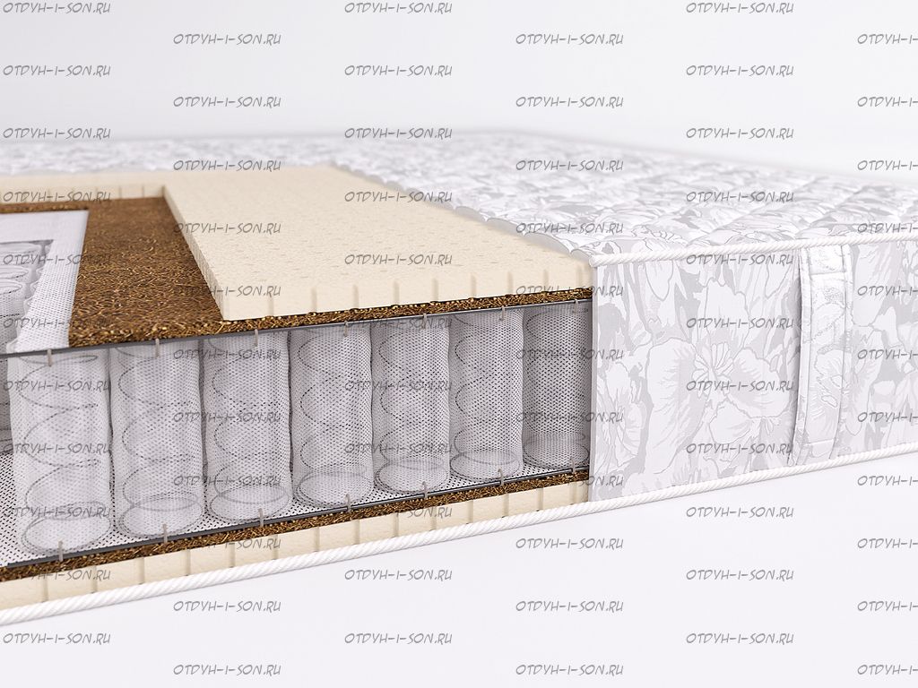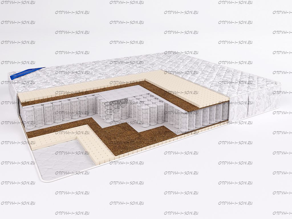 Матрас бесклеевой Элит Престиж Beautyson + наматрасник. Матрас изготавливается без использования клея. Состав матраса по слоям: Трикотажный чехол (Стежка: синтепон 250 г/м2) Хлопчатобумажное полотно Перфорированный латекс (2 см) Латексированная кокосовая койра (1 см) Спанбонд Независимый пружинный блок "Покет" (256 пружин на 1 м2) Спанбонд Латексированная кокосовая койра (1 см) Перфорированный латекс (2 см) Хлопчатобумажное полотно Трикотажный чехол (Стежка: синтепон 250 г/м2) Характеристики: Высота 21 см Матрас усилен по периметру боковыми пружинами. Бесклеевая технология пристрелки наполнителей Вентиляционные отверстия Рекомендуемая максимальная масса: до 110 кг