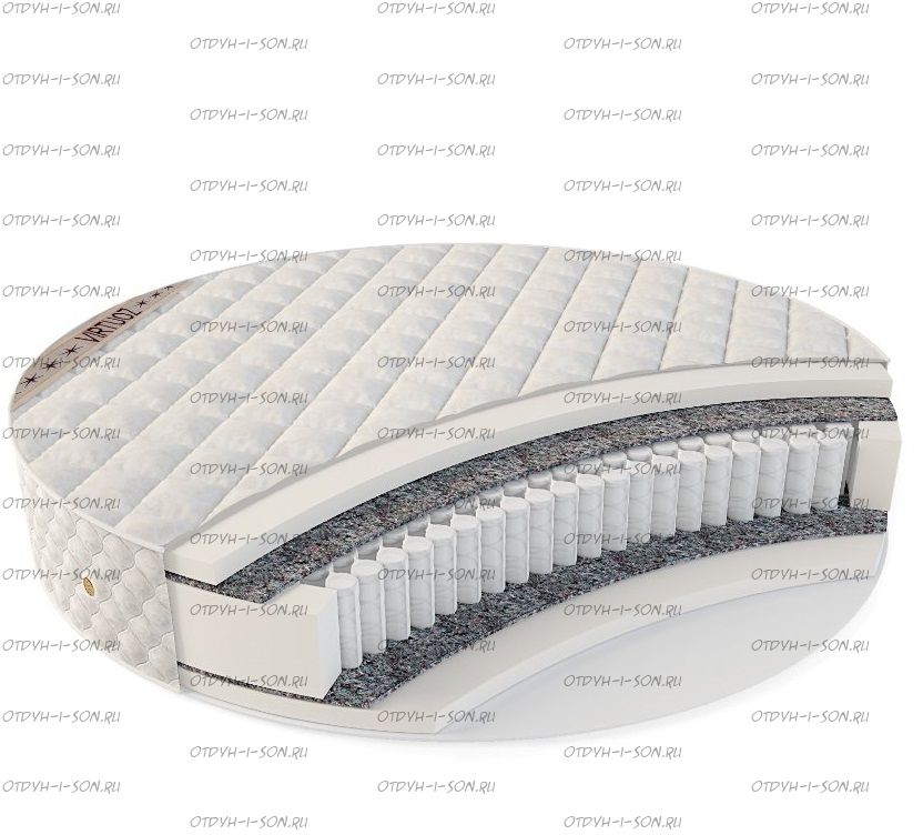 Матрас круглый Legend L, укрепляющий короб по периметру Высота: 23 см Жесткость: средняя Состав матраса слоям: Съемный чехол «white plaid» Внутренний чехол Пенополиуретан h - 2 см. Кристаллическая изоляция BioCrystal 50 гр. SilverSpringPocket 7 zone 580 пр/сп.м h - 18 см. Термовойлок h - 0,5 см. Пенополиуретан h - 2 см. Внутренний чехол Съемный чехол «white plaid»