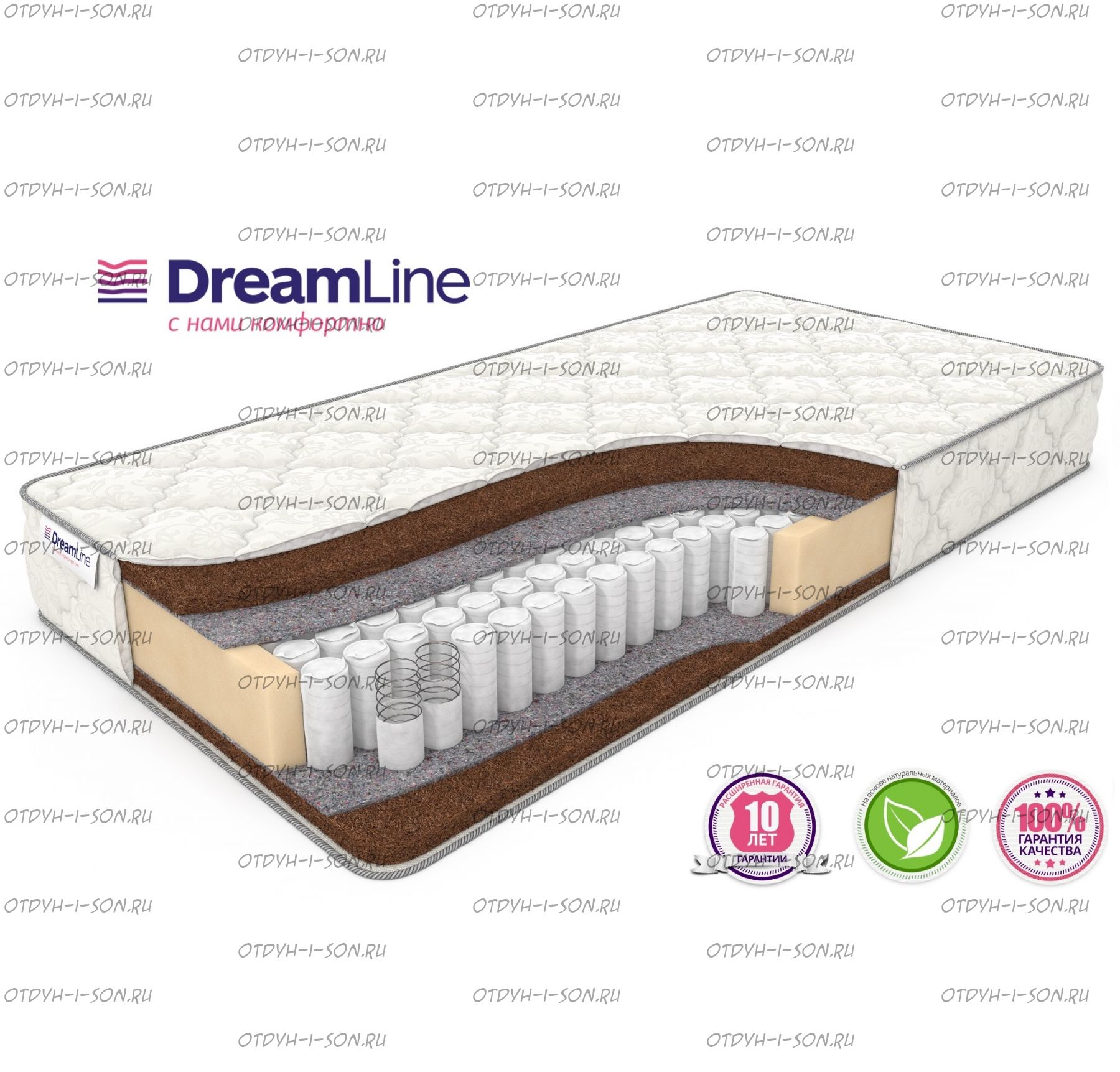 Сочетание независимого пружинного блока с кокосовой койрой дает жесткую поддержку спине с равномерным распределением нагрузки. Все пружинные матрасы фабрики DreamLine изготовлены по безрамочной технологии, с периметром из ППУ 8 см.