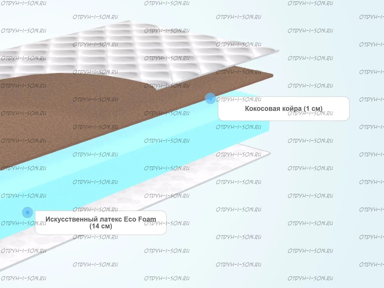 Изделие разностороннее. Одна сторона содержит кокос. Упругий слой отвечает за быстрое восстановление позвоночника в течение ночи. Вторая сторона представлена основой из ППУ. Пенополиуретан точно подстраивается под человека и позволяет максимально расслабиться. Изделие не деформируется и сохраняет первоначальную форму весь срок службы.