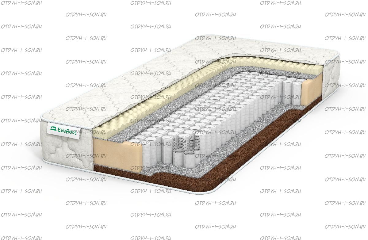 Матрас Everest Кокос латекс 7 зон TFK. Сторона матраса, организованная с использованием блока кокосовой койры (толщина 3 см) отличается высокими ортопедическими показателями. Она не дает позвоночнику прогибаться, формируя жесткое и упругое ложе. Для мягкой стороны используется 7-зональный латекс, являющийся изюминкой модели. Благодаря фигурной нарезке и рельефной поверхности он выполняет две функции: массирует тело во время сна и формирует оптимальную поддержку для разных частей тела. Матрас заключен в плотный чехол из натурального хлопкового жаккарда.