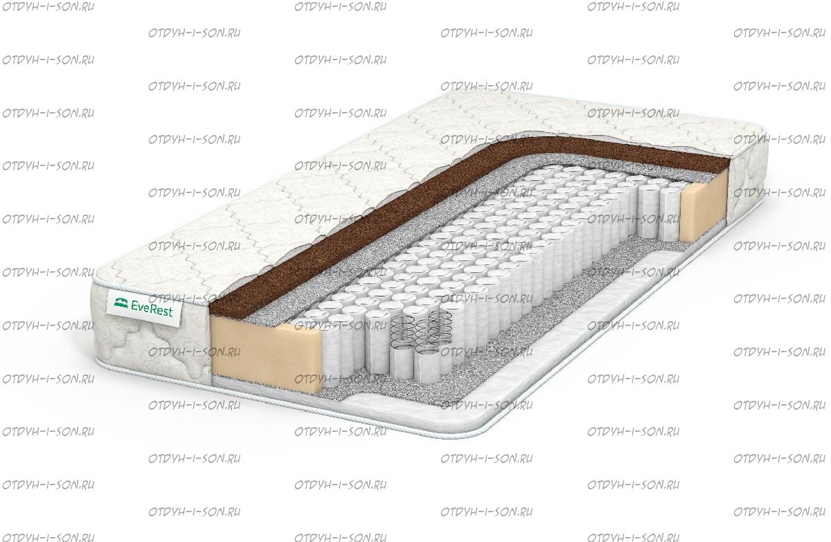 Матрас Everest Кокос-хол TFK. Жесткая сторона матраса сформирована 2-сантиметровым слоем природной кокосовой койры. Она отвечает за хорошую вентиляцию конструкции и ее высокие ортопедические свойства. Сторона умеренной жесткости способна анатомично повторять контуры человеческого тела благодаря холлофайберу. После снятия давления материал восстанавливается и принимает первоначальные очертания. Холлофайбер отличается высокой экологичностью и гигиеничностью. Жесткая кокосовая сторона, в которой тело не утопает, будет хороша в жару. А сторона с холлофайбером создаст дополнительную буферную зону для сохранения тепла.