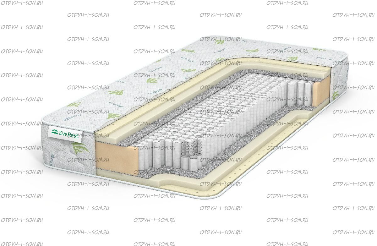 Матрас Everest Рестфом латекс TFK. Наполнение матраса с каждой стороны состоит из искусственного латекса толщиной 3 см и натурального толщиной 1 см (прилежит непосредственно к телу). Материал делается методом вспенивания, он хорошо пропускает воздух и, наряду с пружинами, обеспечивает прекрасную вентиляцию всей конструкции. Это противодействует задержке влаги и размножению бактерий. Матрас остается всегда чистым и гигиеничным. Пружины блока ТФК упакованы в индивидуальные чехлы из нетканого текстиля. Благодаря этому каждая из них при деформации не затрагивает остальные. Прогибы получаются только локальными. Конструкция матраса заключена в чехол из плотного хлопкового жаккарда.