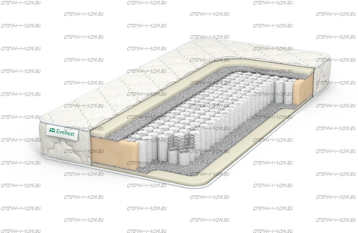 Матрас Everest Рестфом 15 TFK. Низкая цена матраса достигается за счет использования синтетического латекса, который достойно заменяет натуральный материал. Он формирует мягкое ложе, на котором тело отдыхающего принимает анатомически удобное положение. Экологичный латекс позволяет матрасу хорошо вентилироваться, не накапливать влагу от пота. Пружинный блок ТФК, способный деформироваться точечно из-за независимо работающих пружин, обладает средними ортопедическими показателями. Хлопковый чехол матраса приятен для кожи и хорошо отводит влагу.