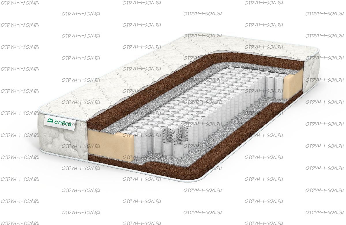 Матрас Everest Хард кокос 20 TFK. Модель включает блок независимых усиленных пружин TFK с плотностью 256 пружинок на квадратный метр. Конструкция отвечает за точечную ортопедическую передачу усилий, при которой матрас прогибается только на участке приложения давления. Жесткость создается листами натурального кокосового волокна. Материал хорошо вентилируется, не позволяет накапливаться воде и пыли, выдерживает большие нагрузки.