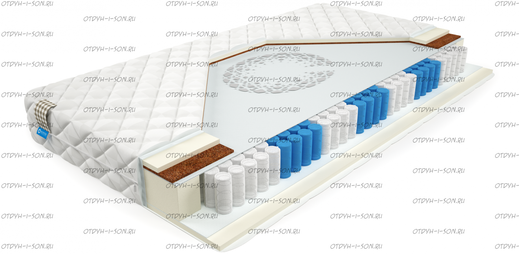 Матрас Rest L + подушка. Матрас BioCrystal Rest L - разносторонний матрас средней жесткости. Матрас c ортопедическим эффектом на основе семи-зонного пружинного долговечного блока независимых пружин SilverSpringPocket 7 zone с Био Кристаллами внутри. Данный блок насчитывает 580 металлических пружин на одно спальное место, это оптимальное количество пружин для бюджетного матраса. 7 зональный пружинный блок SSP 580 значительно прочнее обычного блока независимых пружин, и имеет большее количество витков, что, в свою очередь, лучше сказывается на упругости матраса и качестве сна. Матрас насчитывает семь зон жесткости и правильно повторяет изгибы позвоночника во время сна или отдыха. С каждой стороны матраса расположены по 2 сантиметра пенополиуретана и с одной стороны – 1 сантиметр латексированного кокоса. Кокосовая койра, которую использует наша фабрика, изготовлена на современном оборудовании в Европе, мы используем только длинноволокнистый кокос, который будет служить дольше обычного кокосового волокна. Это оптимальный выбор для тех, кому важен комфортный сон и долговечность матраса.